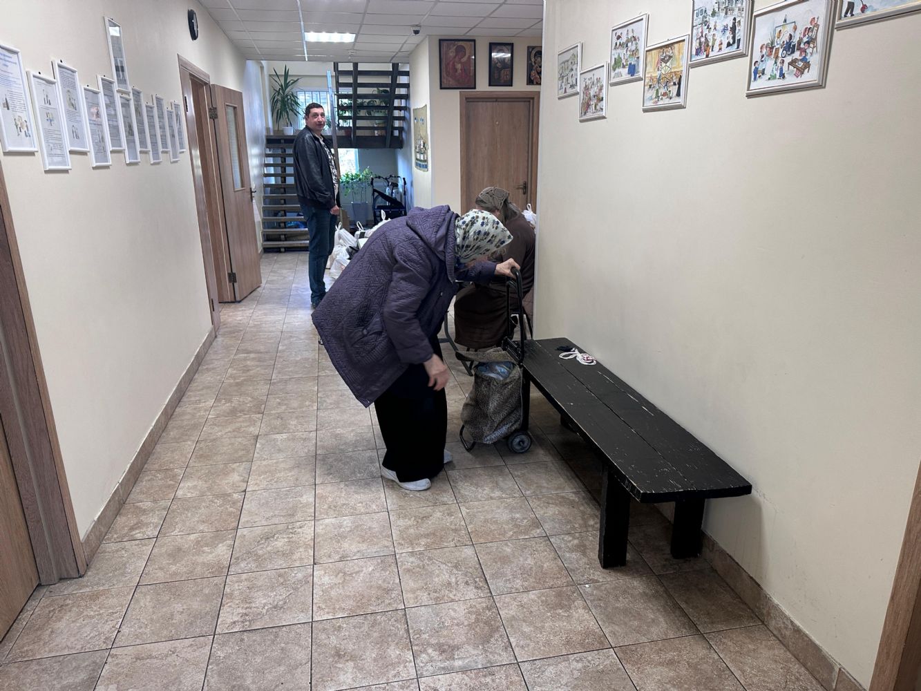 Автоволонтеры по традиции погрузили наборы в машины и поехали по адресам к тем подопечным, которые далеко живут или по состоянию здоровья не могут приезжать за наборами. При входе в дом осуществлялась выдача продуктов тем, кто живет недалеко от Лавры или могут сами прийти за набором.