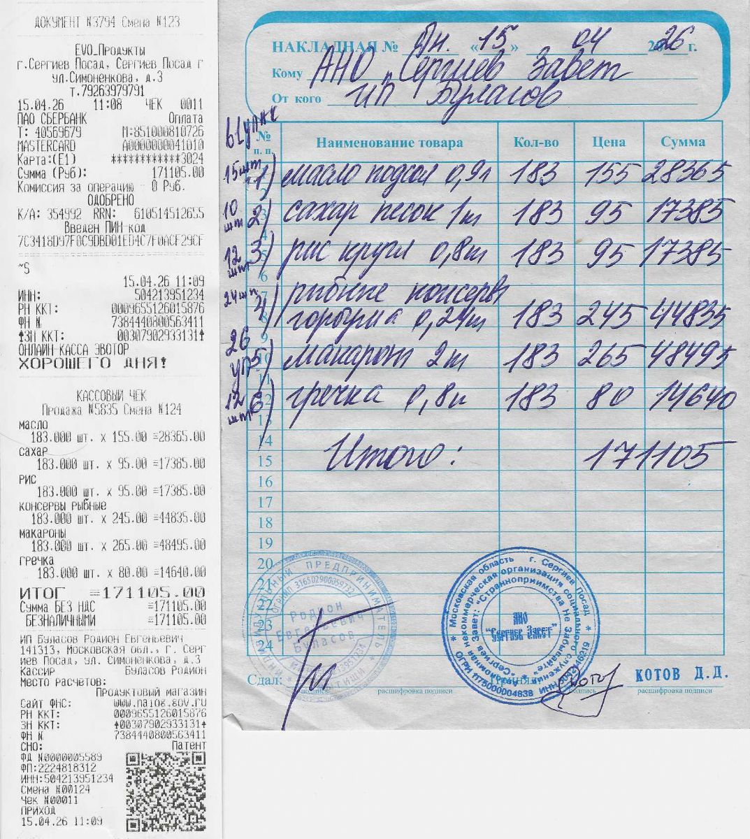 В среду, 15 апреля, состоялась доставка продуктов для благотворительного проекта Социальной службы Лавры «Продукты в помощь». Наши трудники и волонтеры привезли и выгрузили продукты. В субботу состоится фасовка и раздача продуктовых наборов. Благодаря Вам, наши дорогие благотворители, мы собрали сумму 171 555 руб. В состав набора в этом месяце будут входить: бутылка масла растительного 0,9 л, макароны 2 кг, гречка 0,8 кг, рис 0,8 кг, сахар 1 кг, горбуша 240 г.