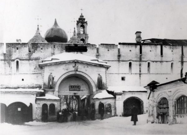 Но как видно из фотографии, сделанной после 1920 года, бани на территории монастыря все же открыли. На фотографии еще видны следы былого благолепия обители, росписи, пристройки. Справа каменное здание (не сохранилось до настоящего времени). При ближайшем рассмотрении пространства внутри ворот можно увидеть захоронение некрополя монастыря и определить пределы захоронений в пространстве между Успенским собором и воротами монастыря.
