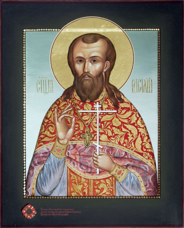 Священномученик Василий родился 28 июля 1894 г. в семье псаломщика. В 1912 г. Василий окончил Переяславское Духовное училище и поступил во Владимирскую Духовную семинарию, где окончил только первый курс, и поступил псаломщиком в храм в родном селе. С 1919 по 1922 гг. он служил в армии, а затем снова псаломщиком. В 1925 г. Василий Васильевич был рукоположен во диакона ко храму в селе Успенское Ивановской области, а в 1928 г. во священника ко храму в честь Тихвинской иконы Божией Матери села Титовское Загорского района Московской области, где он служил до 1936 г. Как и все священнослужители того времени, отец Василий и его семья лишались избирательных прав. Во время коллективизации их выселили из дома и отняли имущество.