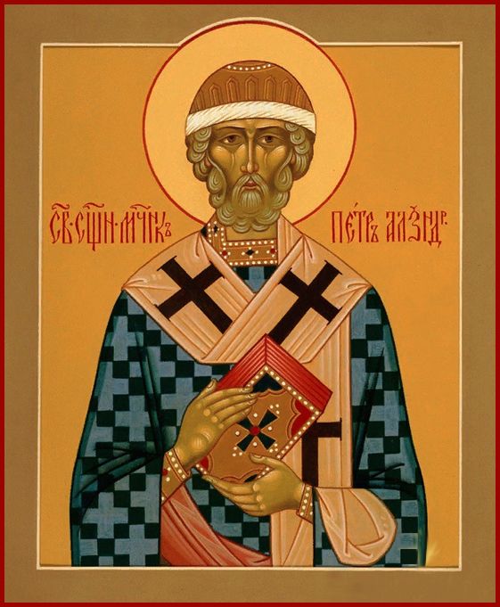 Святой священномученик Петр, архиепископ Александрийский, родился и вырос в Александрии. Был высокообразован, занимал должность начальника Александрийской школы. В 300 г. он вступил в управление Александрийской Церковью. Под мудрым окормлением святого Петра Александрийская Церковь, несмотря на гонения, крепла и умножалась. Но вот, по приказу императора Максимиана, святитель был схвачен и осужден на смертную казнь. Множество людей собралось у входа в темницу, выражая свое негодование. Желая избежать народного мятежа и кровопролития, святитель направил властям письмо, в котором предлагал разобрать заднюю стену темницы с тем, чтобы его смогли тайно от народа вывести на казнь. Темной ночью святой Петр cам вышел навстречу палачам, которые вывели его за городские стены и обезглавили на том же самом месте, где некогда был казнен святой апостол Марк, а голос с неба, который слышала одна святая дева в эту ночь, возвестил: «Петр – начало Апостолов, Петр – конец александрийских мучеников».