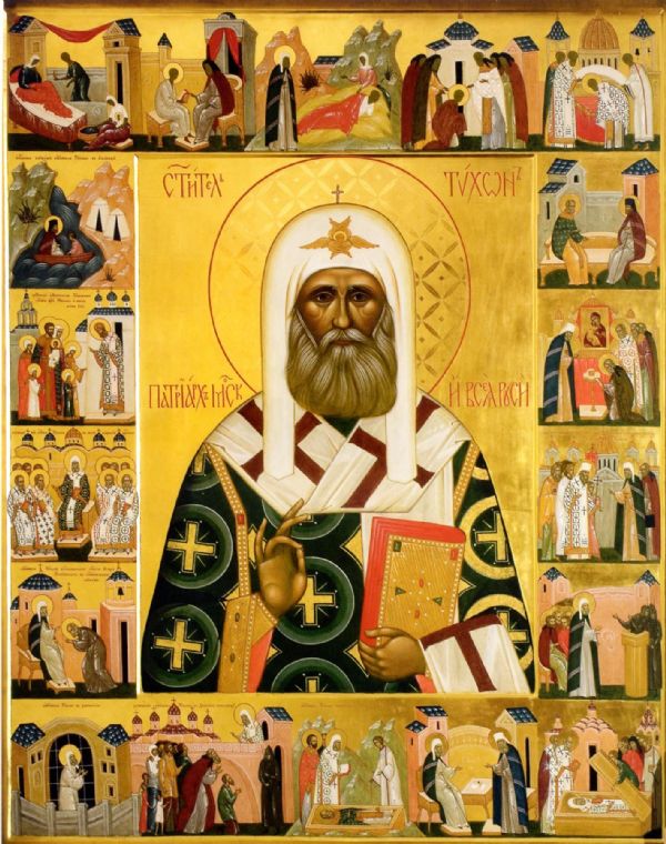 Будущий патриарх Тихон, Василий Иванович Белавин родился в 1865 г. в Псковской губернии, в семье священника. Василий получил духовное образование и в двадцать шесть лет принял монашество с именем Тихон, в честь святителя Тихона Задонского. Он возглавлял Холмско-Варшавскую, Ярославскую епархии, помогал обустраивать духовную жизнь православной Америки. В 1917 г. на Соборе Русской Православной Церкви был поднят вопрос о восстановлении патриаршества. Жребий выпал на митрополита Московского Тихона. В начале двадцатых годов под предлогом помощи голодающим была предпринята попытка разгрома Церкви. Патриарх Тихон благословил тогда жертвовать церковные ценности, но выступил против посягательств на святыни. В результате он был арестован и год находился в заточении. И до ареста, и после на патриарха организовывались покушения. В 1925 г., в праздник Благовещения, патриарх Тихон скончался. ″Не будьте побеждены злом. Побеждайте зло добром!″ - были его последние слова.