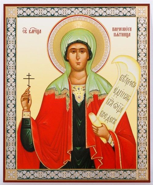 На Руси Параскева издавна считается одной из наиболее почитаемых святых. Ей посвящали храмы и придорожные часовни (Пятницы), признавали покровительницей полей и скота. В день ее памяти русские люди приносили в храм плоды для освящения. Параскева считается целительницей душевных и телесных недугов, хранительницей семейного благополучия и счастья. Родители святой назвали дочь Пятницей, по-гречески — Параскевой, поскольку особо чтили пятницу, когда на Кресте пострадал Спаситель. Во время гонений на христиан Параскева отказалась принести жертву идолам и была подвергнута истязаниям. Ее повесили на дереве и сначала терзали тело железными гвоздями, а потом жгли огнем и, наконец, обезглавили. Христиане с благоговением похоронили тело святой Параскевы, и мощи великомученицы вскоре прославились многочисленными исцелениями болящих.