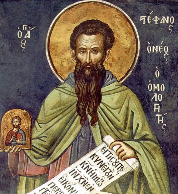 Родился в 715 г. в Константинополе от благочестивых родителей, давших обет посвятить сына Богу. Еще в отрочестве святой принял иночество и подвизался на Авксентьевой горе, против Константинополя, прославившись святой жизнью и благотворительностью. За великие подвиги Бог прославил его даром чудотворения: святой отверз очи слепому, исцелил кровоточивую, не раз утишал морское волнение и избавлял корабли от потопления. Св. Стефан пострадал за почитание св. икон при императоре Константине Капрониме, в 786 г. Он перенес ссылку на острове Проконнис; был заключен в темницу в Константинополе, где за 40 дней предузнал свою кончину и, готовясь к ней, постился 40 дней, ничего не вкушая; перенес жестокие побои и скончался, влачимый по улицам Константинополя.