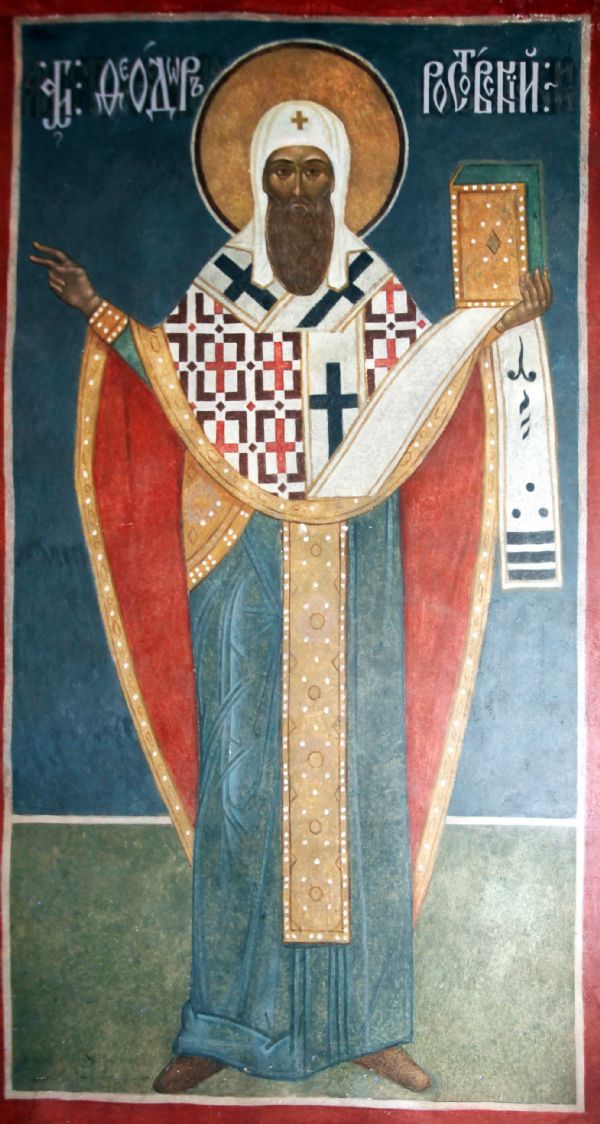 Святитель Феодор - архиепископ Ростовский был сыном Стефана (родного брата преподобного Сергия Радонежского). Овдовев, Стефан принял монашество и вместе с сыном пришел в монастырь к преподобному Сергию, который, провидя подвижническую жизнь отрока, постриг его с именем Феодор. По благословению Преподобного, святитель Феодор основал Старый и Новый Симонов монастыри, где приняли постриг иноки Кирилл и Ферапонт – будущие основатели Белозерских монастырей. Святитель вел строгую подвижническую жизнь, и великий князь Димитрий Донской избрал его своим духовником. В 1387 г. он был назначен на Ростовскую кафедру. Скончался в 1394 г.