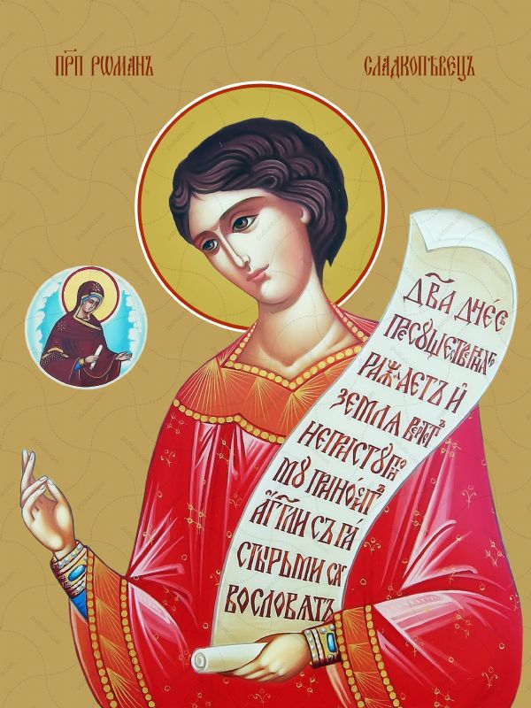 Преподобный Роман Сладкопевец родился в V в. в Сирии. Он переехал в Константинополь и стал пономарем в храме Святой Софии. Но у него не было способностей ни к пению, ни к публичному чтению. Остальные пономари и младшие священники храма не раз смеялись над ним. Однажды обиженный и опечаленный юноша долго молился перед иконой Богородицы. Ночью во сне Богоматерь явилась Роману и протянула свиток, велев его съесть. На следующий день как раз был праздник Рождества Христова. На ночной праздничной службе Роман запел дивным голосом слова праздничного песнопения: ″Дева днесь Пресущественнаго раждает...″.