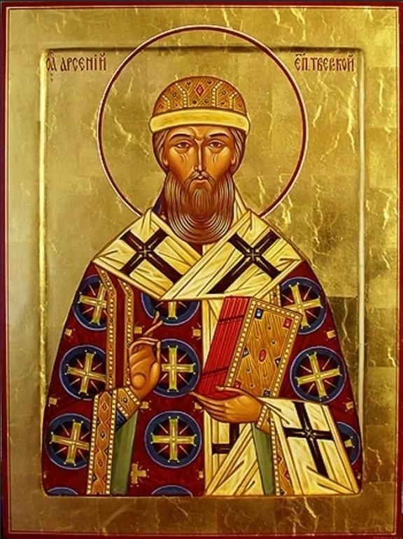 Святитель Арсений, епископ Тверской, родился в Твери, в молодых летах принял постриг в Киево-Печерском монастыре. Даже среди иноков древнего монастыря, отличавшихся благочестием, Арсений выделялся святой жизнью – строгим хранением монашеских обетов, знанием Церковного устава, начитанностью в Священном Писании и трудолюбием. При митрополите Киевском Киприане он служил архидиаконом, во время отсутствия митрополита управлял делами Киевской митрополии. 3 июля 1390 г. он вместе с митрополитом Киприаном прибыл в Тверь, где по просьбе Тверского князя Михаила Александровича состоялся Собор русских и греческих иерархов для суда над Тверским епископом Евфимием. Князь и епископ были в многолетней ссоре, многие тверичи представляли на епископа тяжкие обвинения. После безуспешных попыток водворить в Твери церковный мир, митрополит Киприан ″отставил от епископства″ Евфимия и отправил его в Москву, в Чудов монастырь. На Тверскую кафедру был назначен святой Арсений. Но тот ″бояся владычества прияти во Твери, виде бо там вражду и брань многу, и смутися и ужасеся″. По возвращении митрополита Киприана и архидиакона Арсения в Москву Тверской князь прислал своих бояр с челобитной к митрополиту о посвящении на Тверскую кафедру Арсения. Арсений и на этот раз не соглашался. По словам летописца, в 1390 г. ″едва умолиша архидиакона Арсения митрополита быти во Твери″. Под угрозой соборного запрещения митрополит и князь наконец получили его согласие на хиротонию, которая состоялась 15 августа 1390 г. Среди епископов, участвовавших в рукоположении его, был святитель Стефан, епископ Пермский. Вступив на кафедру, епископ Арсений, как великий молитвенник и миротворец, смог прекратить многие раздоры в Тверском княжестве. В его епископство, с 1390 по 1409 гг., были построены и освящены соборы в честь Архангела Михаила в Старице и Микулине, обновлен Спасо-Преображенский кафедральный собор, заложена соборная колокольня. Святитель основал на реке Тьмаке, близ Твери, Желтиков монастырь, где по подобию Киево-Печерского монастыря была построена церковь во имя преподобных Антония и Феодосия Печерских и каменный Успенский собор. Желая, чтобы иноки новой обители всегда назидались по-двигами Печерских отцов, святитель Арсений повелел в 1406 г. сделать с Киево-Печерского Патерика список, представляющий самую древнюю из дошедших до нашего времени редакцию этого драгоценного памятника русской письменности, получившую название Арсеньевской. Почил святитель в 1409 г., 2 марта, и был погребен в созданном им Желтиковом монастыре Успения Пресвятой Богородицы. В 1483 г. мощи его были обретены нетленными и поставлены в монастырском соборе. В том же году иеромонахом Феодосием написано житие и канон святителю. На Соборе 1547 г. состоялось общецерковное прославление святителя Арсения.