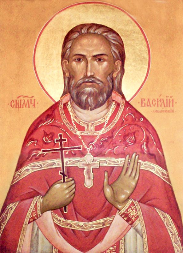 Священномученик Василий Михайлович Архангельский родился в 1874 г. в селе Русалкино Тульской губернии в семье диакона. Окончил Тульскую духовную семинарию, преподавал в начальных классах, затем женился на учительнице и принял священнический сан. С 1885 по 1891 гг. служил в Ахтырском храме с. Ахтырка Сергиево-Посадского района. Отец Василий очень любил детей и, будучи приходским священником, всегда находил общий язык с юными прихожанами. В его семье впоследствии родилось шестеро детей. В 1931 г. по обвинению в «невыполнение твердого задания» отец Василий был приговорен к 3 годам ссылки, но оправдан областным судом и продолжил служение до следующей волны гонений. В последние годы перед арестом он служил в храме Успения Пресвятой Богородицы села Люблино Каширского района Московской области. Осенью 1937 г. отец Василий был арестован и содержался в Каширской тюрьме. В доносе на него, в частности, говорилось, что «Архангельский агитирует детей, чтобы они ходили в церковь». Священника обвиняли в контрреволюционной антисоветской деятельности. Никакой вины за собой отец Василий не признал. Тройка НКВД приговорила иерея Василия Архангельского к расстрелу. Священномученик Василий Архангельский был расстрелян на Бутовском полигоне 16 ноября 1937 г. и погребен в безвестной общей могиле.