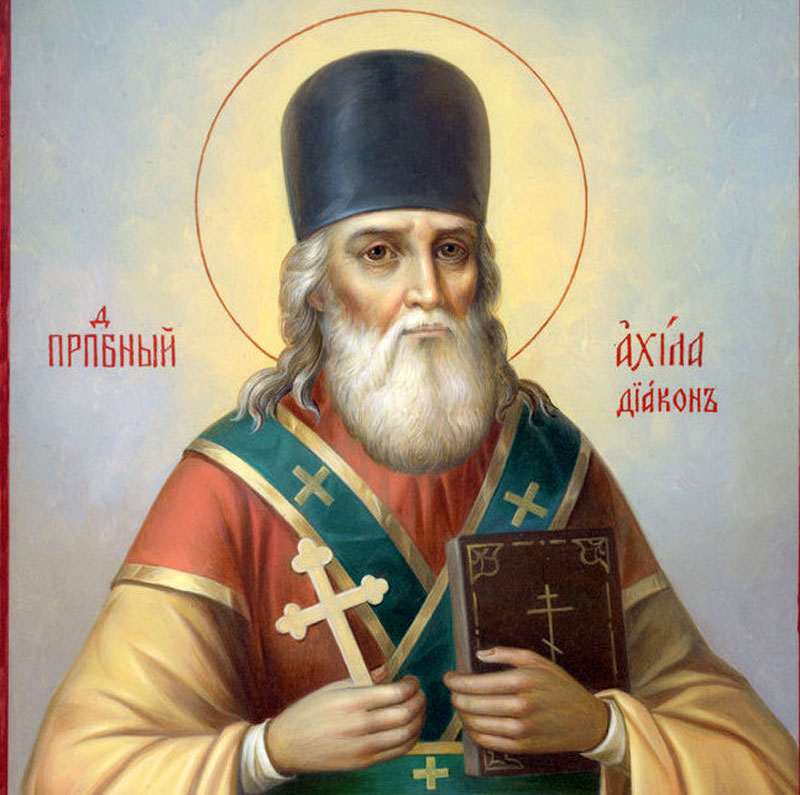 Преподобный Ахила диакон (XIV в.), монах Печерского монастыря. Приняв на себя Ангельский образ, проходил тесный путь иночества с великим терпением, послушанием и смирением. Воздержанием своим в пище и питии он превосходил многих подвижников: он не вкушал ни сладкой, ни вареной пищи, овощи же употреблял редко, и то в малом количестве. Обыкновенно пищей его была одна просфора в неделю. Долгое время преподобный Ахила провел в затворе.