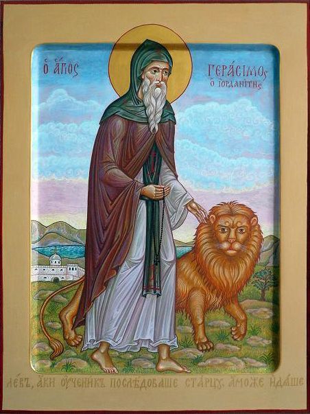 Святой подвижник встретил в пустыне раненого льва и вылечил его. В благодарность, лев стал служить старцу как домашнее животное до самой его кончины, после которой и сам умер на могиле и был зарыт близ гроба святого. Преподобный Герасим мирно отошел ко Господу в 451 г.