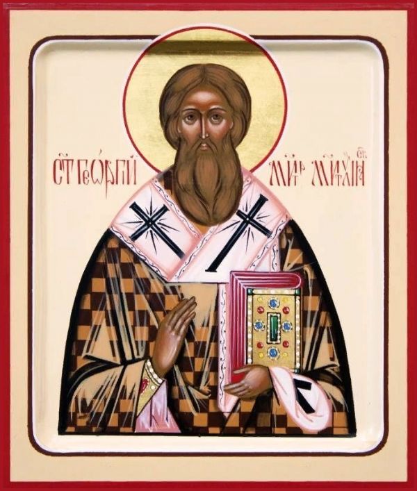 В годы царствования Константина Порфирородного святой Георгий был возведен на архиерейскую кафедру города Митилена, расположенного на острове Лесбос. Жизнь святителя сияла целомудрием и чистотой и была подобна жизни Ангельской. Он имел дар чудотворения, изгонял нечистых духов и исцелял неизлечимые болезни. Святитель отличался милосердием, щедро помогал всем нуждающимся. В конце своей жизни, в 815 г., во время царствования иконоборца Льва Армянина, святой архипастырь был изгнан и сослан в Херсонес, где и скончался после 820 г. В час его кончины над городом Митилена на небе воссияла яркая звезда.