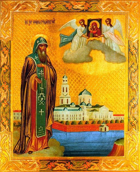 Преподобный Нил Столобенский родился в семье крестьянина в небольшом селении Новгородской епархии. Принял иноческий постриг в обители преподобного Саввы Крыпецкого. Через 10 лет, желая вести уединенную жизнь, святой ушел из обители в глухие леса. Вскоре люди стали приходить к нему за благословением и советами. Святой усердно молил Пресвятую Богородицу указать ему иное место для пустынных подвигов и однажды услышал голос: «Нил! Иди на озеро Селигер. Там на острове Столобенском ты можешь спастись». Преподобный нашел это место, выкопал себе пещеру, а затем срубил келлию, в которой подвизался 27 лет. К подвигам воздержания и безмолвия преподобный Нил добавил еще один, особенный подвиг - он никогда не ложился спать, а лишь слегка дремал, опираясь на крюки, вбитые в стену келлии.