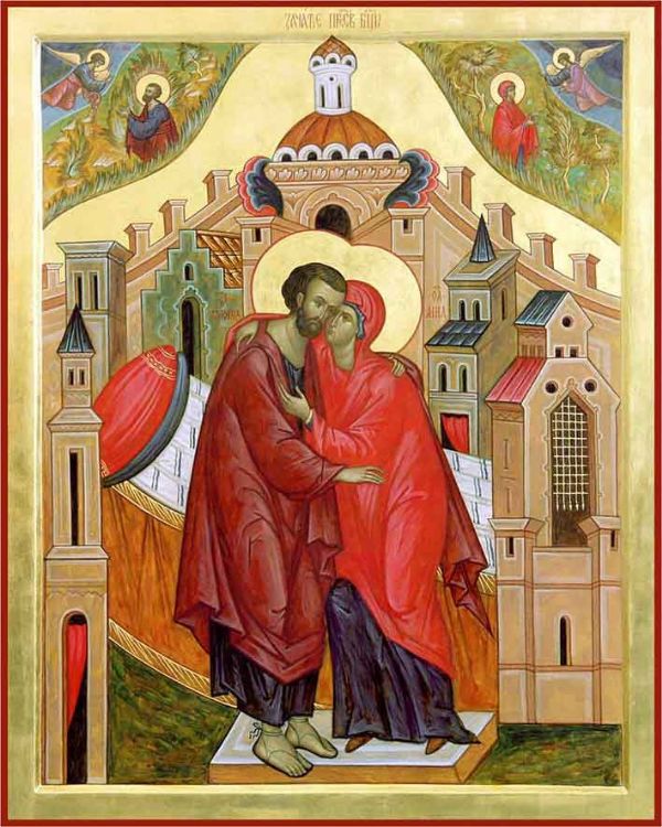Святая праведная Анна была младшей дочерью священника Матфана, происходившего из колена Левина из рода Ааронова. Муж ее, святой праведный Иоаким, был родом из колена Иудина, из дома царя Давида. По древнему обетованию из рода Давидова должен был произойти Мессия. Праведным Богоотцам Анне и ее мужу Иоакиму за бездетность, считавшуюся в народе Израиля свидетельством греховности, приходилось терпеть презрение людей. Когда Анна узнала, что дары Иоакима даже не были приняты в Иерусалиме священником и тот, скорбя, уединился в пустыне, она в строгом посте стала умолять Бога о даровании ребенка. Нередко Господь, прежде чем дать драгоценный дар, оставляет человека одного в страдании ради возрастания в его сердце истинной любви. Молитвы супругов были услышаны: Ангел возвестил им о грядущем рождении Дочери, Которую благословит весь мир, и повелел встретиться в Иерусалиме. По преданию, Анна, проведя последние годы в храме вместе с Дочерью, мирно скончалась в Иерусалиме в возрасте 79 лет, через 2 года после своего мужа. Успение ее было до Благовещения Пресвятой Деве Марии.