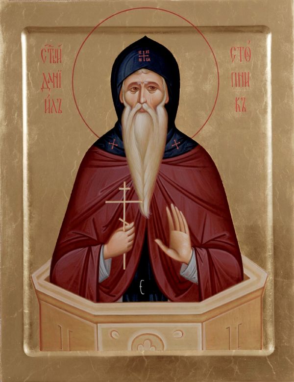 Преподобный Даниил Столпник родился в селе Вифара, близ города Самосаты в Месопотамии. Мать его Марфа долго была бесплодной и в молитвах дала обет, если родится ребенок, посвятить его Господу. В 12 лет отрок ушел из дома в монастырь. Однажды вместе с игуменом монастыря Даниил посетил святого Симеона Столпника, который предрек юному монаху, что и он понесет подвиг столпничества. Преподобный Даниил продолжил подвижническую жизнь в затворе. Когда в видении ему было указано место нового подвига, он удалился во Фракийскую пустыню вместе с двумя учениками, где они достроили столп, на котором преподобный Даниил провел 33 года. К столпу стекались люди, несчастные и больные, и все получали от преподобного Даниила помощь и исцеление. Молитв святого подвижника испрашивали византийские императоры. Из многочисленных предсказаний преподобного наиболее значительным было пророчество о сильном пожаре в Константинополе. Преподобный Даниил обладал еще и даром благодатного слова. Он наставлял многих на путь исправления жизни.