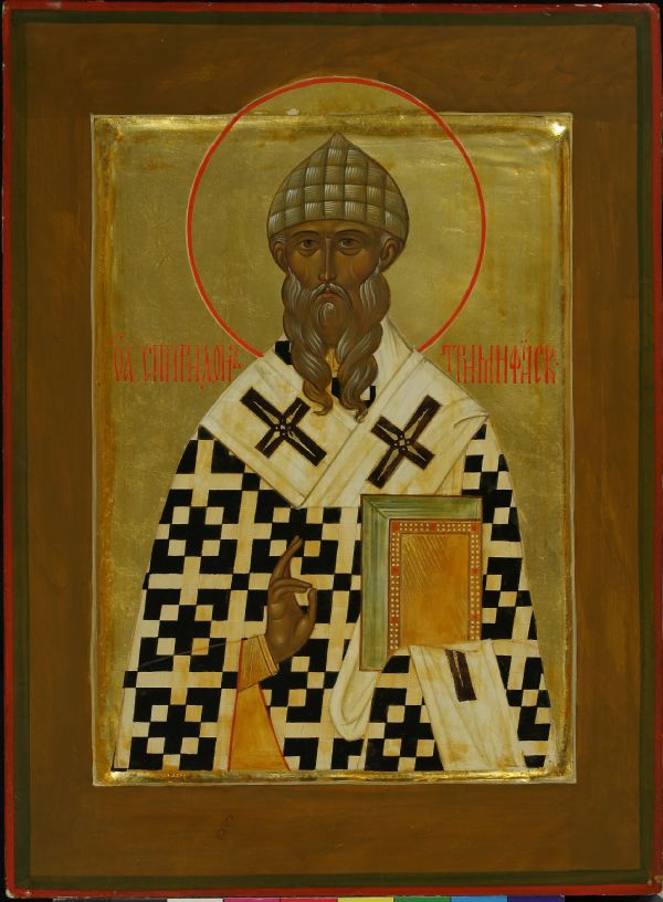 Святитель Спиридон родился на острове Кипр. Овдовев, он был избран епископом города Тримифунта и совмещал пастырское служение с делами милосердия. В 325 г. святитель принимал участие в I Вселенском Соборе, где он обличил греческого философа, защищавшего ариеву ересь. Простая речь святителя показала всем немощь человеческой мудрости перед Премудростью Божией. На том же Соборе святитель явил наглядное доказательство Единства во Святой Троице. Он взял в руки кирпич и стиснул его: мгновенно вышел из него вверх огонь, вода потекла вниз, а глина осталась в руках чудотворца. «Се три стихии, а плинфа (кирпич) одна, — сказал тогда святитель Спиридон,—так и в Пресвятой Троице — Три Лица, а Божество Едино».
