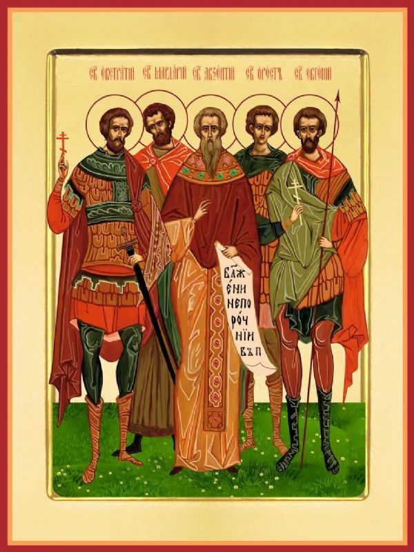 Святые мученики Евстратий, Авксентий, Евгений, Мардарий и Орест пострадали за Христа при императоре Диоклитиане в Севастии, в Армении. В числе первых христиан, принявших тогда мучения, был пресвитер Аравийской церкви мученик Авксентий, заключенный в темницу. Видя непоколебимость христиан, градоправитель Саталиона, благородный военачальник святой Евстратий, бывший тайным христианином, решился на открытое исповедание веры, за что был подвергнут пыткам: его избивали, надевали на ноги железные сапоги, жгли огнем. После этих жестоких мучений его сожгли, а мученика Авксентия обезглавили. Увидев их мученическую смерть, святой Мардарий, который был из простого народа, также исповедал свою веру и был повешен вниз головой. Перед кончиной он произнес молитву: «Владыко Господи Боже, Отче Вседержителю...», которая читается в конце 3-го часа и на полунощнице. Мученику Евгению вырвали язык, отрубили руки и ноги и отсекли голову мечом. Молодой воин святой Орест исповедал себя христианином и за это предстал перед судом. Он был приговорен к сожжению на раскаленном железном ложе, куда взошел, укрепляемый молитвой святого Евстратия. Предсмертная молитва святого Евстратия («Величая, величаю Тя, Господи...») читается на субботней полунощнице.