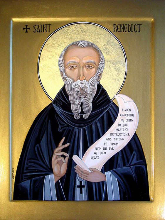 Преподобный Венедикт, основатель западного монашеского ордена бенедиктинцев, родился в итальянском городе Нурсии в 480 г. В 14 лет святой был отправлен родителями на ученье в Рим, однако, угнетенный окружавшей его безнравственностью, он решил посвятить себя другой жизни. Вначале святой Венедикт поселился при церкви святого апостола Петра в селении Еффеди, но молва о его подвижнической жизни заставила его уйти дальше в горы. Там он повстречал отшельника Романа, который постриг его в монашество и указал ему для жительства отдаленную пещеру. Время от времени отшельник приносил святому пищу. Три года в полном уединении святой вел суровую борьбу с искушениями и превозмог их. Вскоре к нему стали собираться люди, жаждавшие жить под его руководством. Число учеников настолько выросло, что святой разделил их на двенадцать общин. Каждая община состояла из двенадцати иноков и составила отдельный скит. Каждому скиту преподобный дал игумена из своих опытных учеников. У преподобного остались ради назидания только новоначальные иноки. Строгие правила, установленные для монахов святым Венедиктом, не всем пришлись по душе, и преподобный не раз становился жертвой клеветы и преследований.