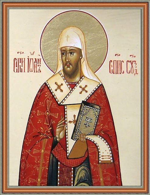 Святитель Иоанн, епископ Суздальский, с юных лет поступил в один из монастырей города Суздаля. За добродетельную и смиренную жизнь святитель в 1350 г. был поставлен первым епископом Суздальским и Нижегородским. Епископ Иоанн удостоился великой милости Божией: во время Божественной литургии Суздальский князь Борис Константинович видел, как Ангел Божий сослужил святителю. Святитель Иоанн известен своей любовью к беднякам и больным; за бедных он ходатайствовал перед князьями об уменьшении налогов, для больных устраивал богадельни и больницы. Много заботился святитель о просвещении христианской верой языческой мордвы. После присоединения Суздаля к Московской митрополии святитель Иоанн принял схиму и удалился в Боголюбский монастырь. Там он жил уединенно и мирно скончался. У гроба святителя засвидетельствованы многочисленные исцеления.