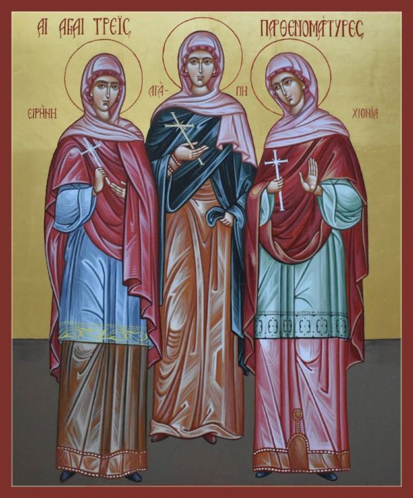 Мученицы Агапия, Ирина и Хиония были родными сестрами, жившими около города Аквилеи в северной Италии в конце III в. Осиротев еще в юном возрасте, они решили не выходить замуж и вели благочестивый образ жизни. Когда император Диоклетиан посетил Аквилею, он воздвигнул жестокое гонение против христиан, так что в скором времени здесь все тюрьмы оказались переполненными.