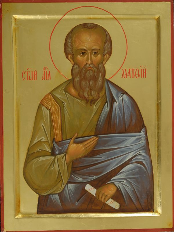 Святой апостол и евангелист Матфей до обращения ко Христу служил мытарем, сборщиком податей для Рима. Услышав глас Иисуса Христа: «Иди за Мной» (Мф. 9. 9), он оставил свою должность и пошел за Спасителем. Восприняв благодатные дары Духа Святого, апостол Матфей проповедовал в Палестине. Перед уходом на проповедь в дальние страны, по просьбе иудеев, остававшихся в Иерусалиме, апостол написал Евангелие. В ряду книг Нового Завета, Евангелие от Матфея стоит первым. Речи и деяния Спасителя Матфей изложил в соответствии трем сторонам служения Христа: как Пророка и Законодателя, Царя над миром невидимым и видимым и Первосвященника, Приносящего Жертву за грехи всех людей. Святой апостол принял мученическую кончину в Эфиопии.