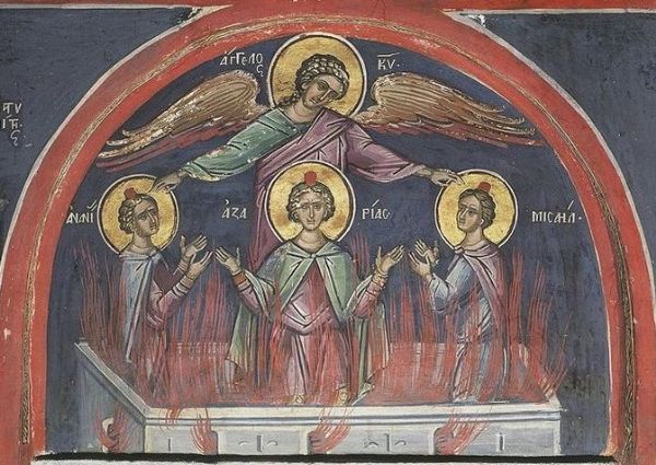 Святые Даниил, Анания, Азария и Мисаил были пленниками царя Навухудоносора. Господь даровал им мудрость, а святому Даниилу - дар прозорливости и истолкования снов. Однажды царь сделал из золота истукана и повелел всем жителям поклоняться ему. Анания же, Азария и Мисаил воспротивились, узнав об этом, Навухудоносор в гневе приказал бросить их в пылающую печь. Пламя опаляло стоящих рядом халдеев, а святые отроки ходили посреди пламени, вознося молитву Господу и воспевая Его (Дан. 3, 26–90). Ангел Господень, явившись, охладил пламя, и отроки остались невредимы. Царь, увидев это, повелел им выйти и обратился к Богу истинному. Отроков царь поставил управлять делами всей страны.