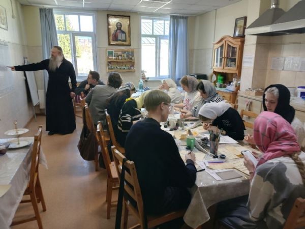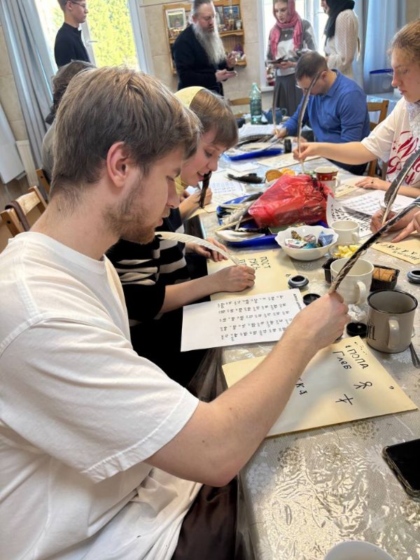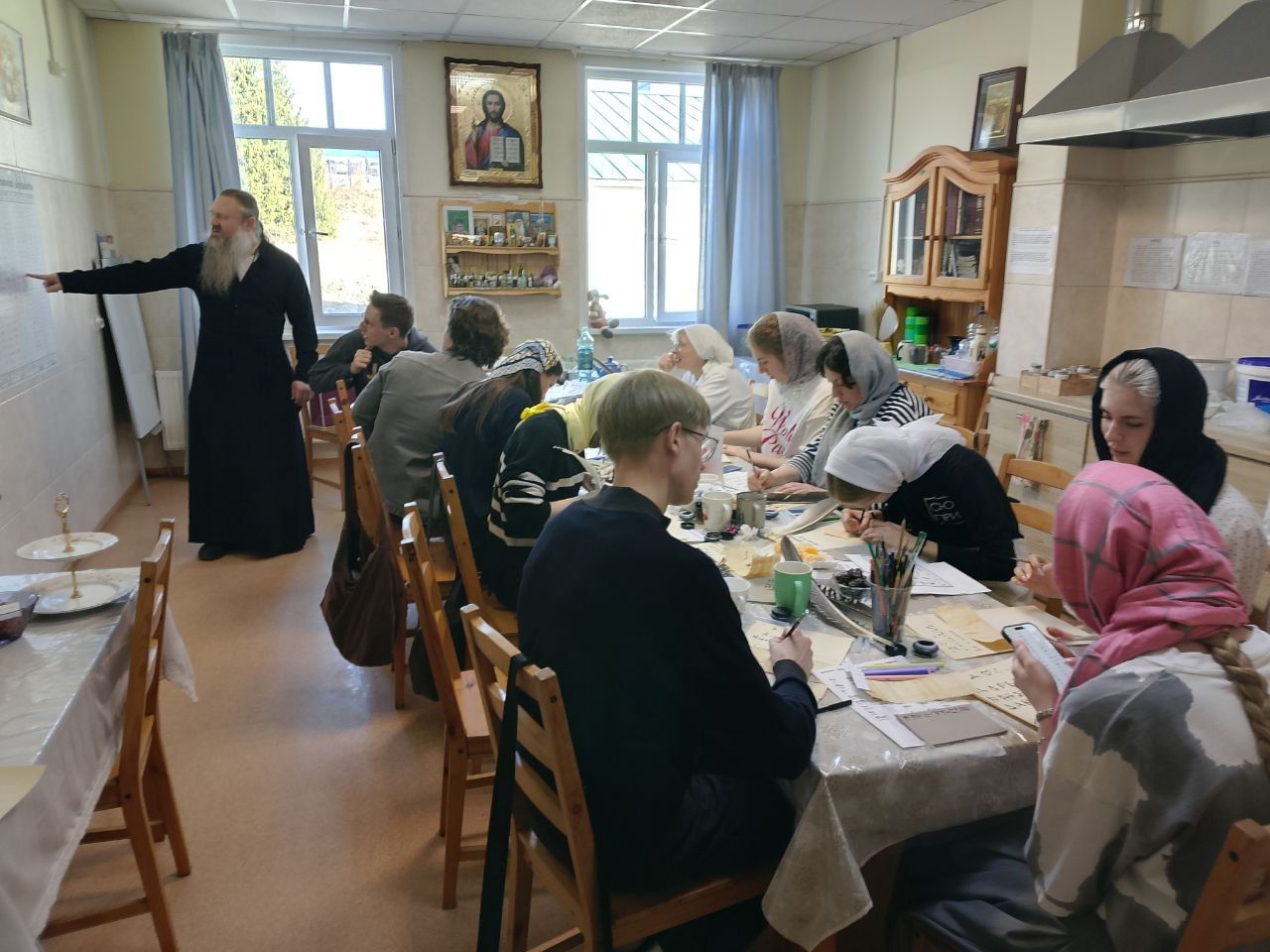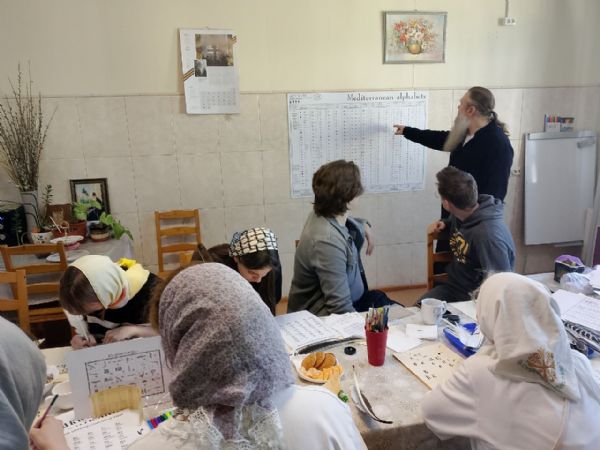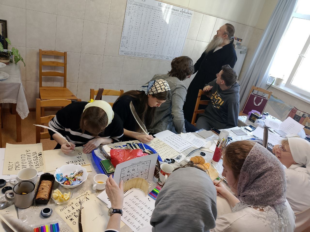 Утром в качестве утешения для новоиспеченных лавриотов была проведена экскурсия по Церковно-археологическому кабинету, а днем руководитель Социальной службы Лавры иеродиакон Парфений показал мастер-класс по чистописанию пером и письму на глиняных табличках.