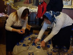 Впереди нас ждала ночная литургия, где во время Причастия наши братья помогали раздавать запивку причастникам. После Великого Освящения воды волонтеры набирали воду для паломников и сотрудников, помогали с доставкой воды домой.