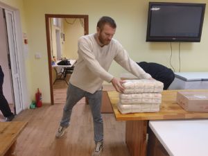 Сегодня наши трудники и волонтеры получили продукты на базе, все выгружено в нашем фасовочном цеху и сразу подготовлено для завтрашней фасовки.