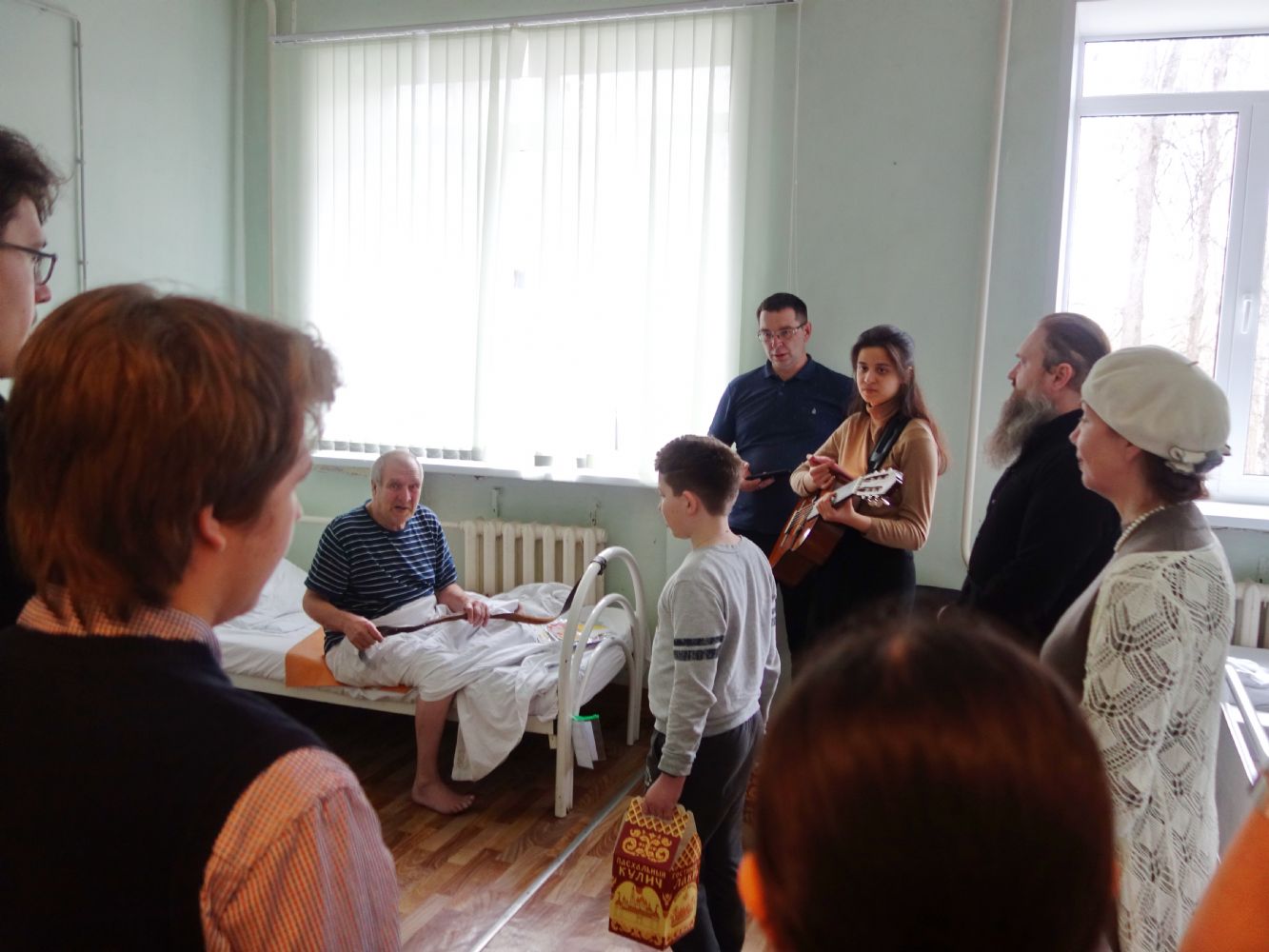 Приезд детей с мини-концертом был встречен с великой радостью и одушевлением. Сначала для тех, кто смог спуститься состоялось выступление в фойе больничного комплекса, а затем ребята прошли по всем палатам, посетив лежачих больных. После стихов и песен воспитанники воскресной школы (это в основном дети священников, работников Лавры и прихожан Покровского храма при МДА) вручили бабушкам и дедушкам свои поделки, собранные своими руками пасхальные сувениры, а также праздничные куличи от Лавры.