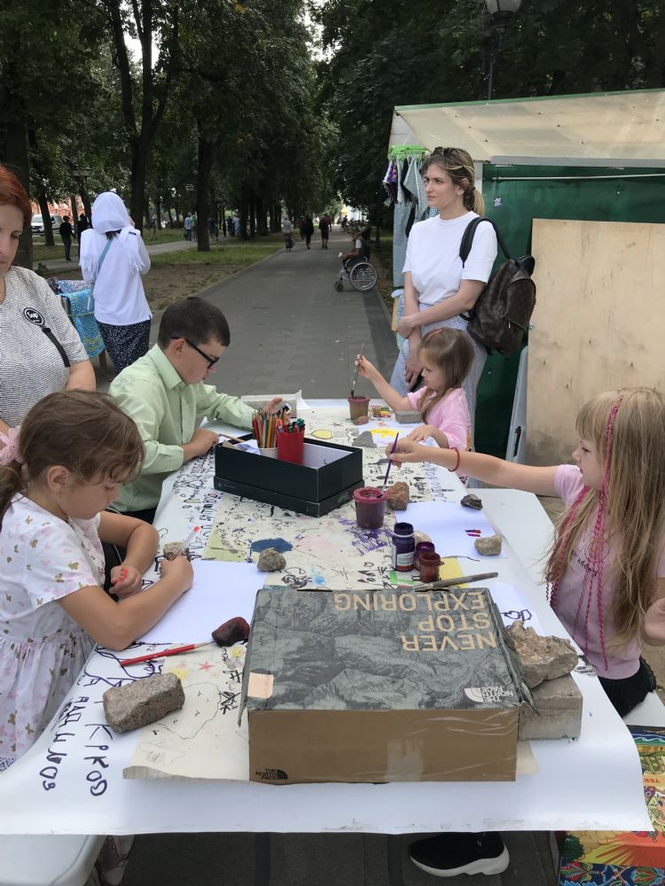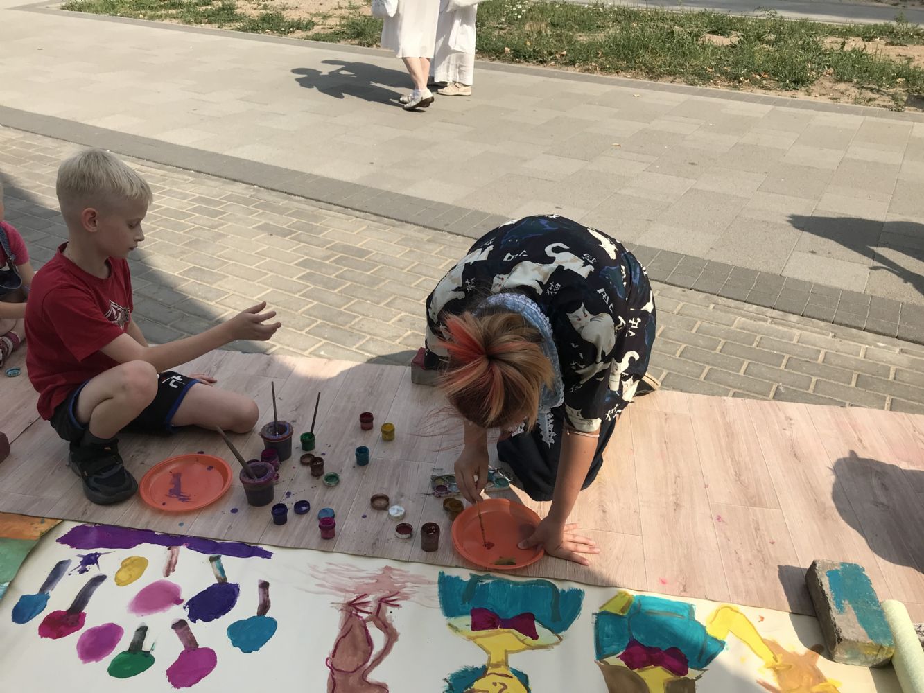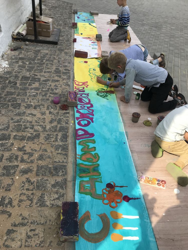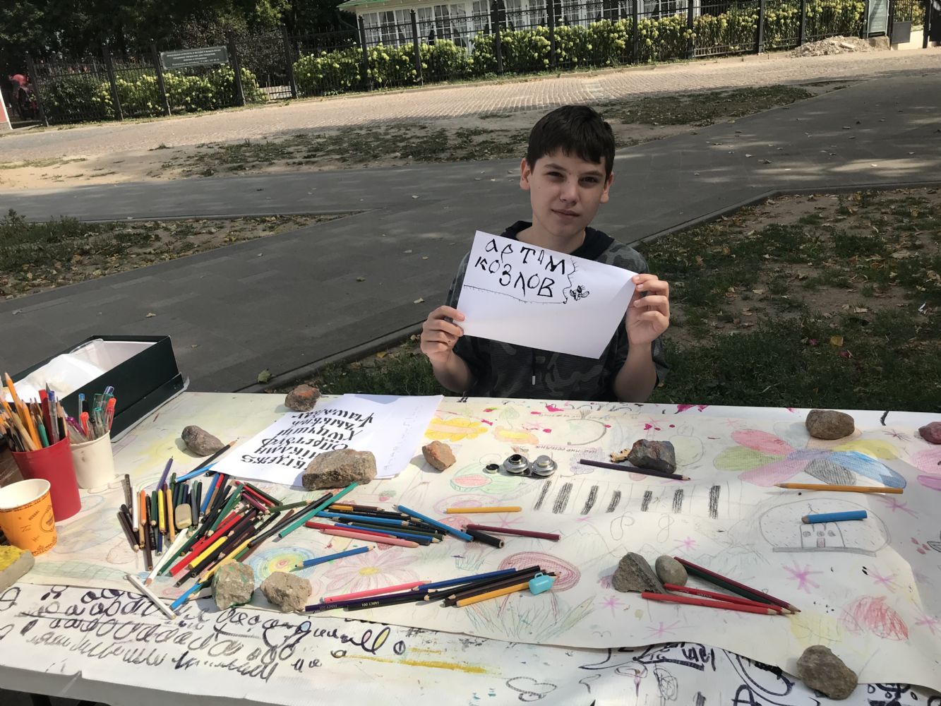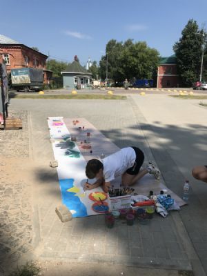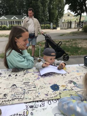 Уже третье лето подряд мы приглашаем всех гостей и жителей города принять участие в создании общего большого рисунка. На столах и асфальтовой дорожке мы раскатываем листы бумаги, выдаём краски и фломастеры. Тема рисования свободная, присоединиться может любой желающий.