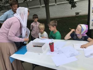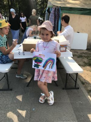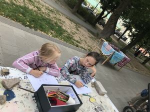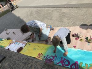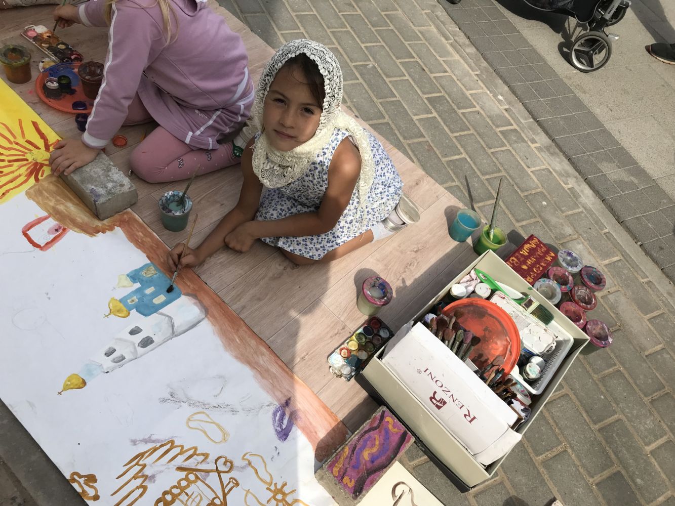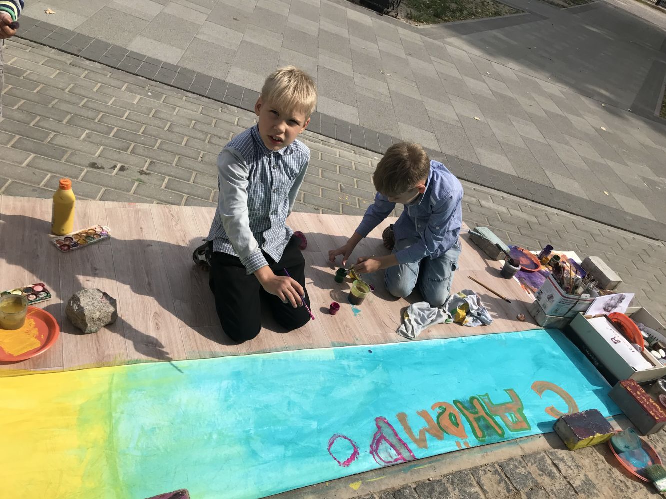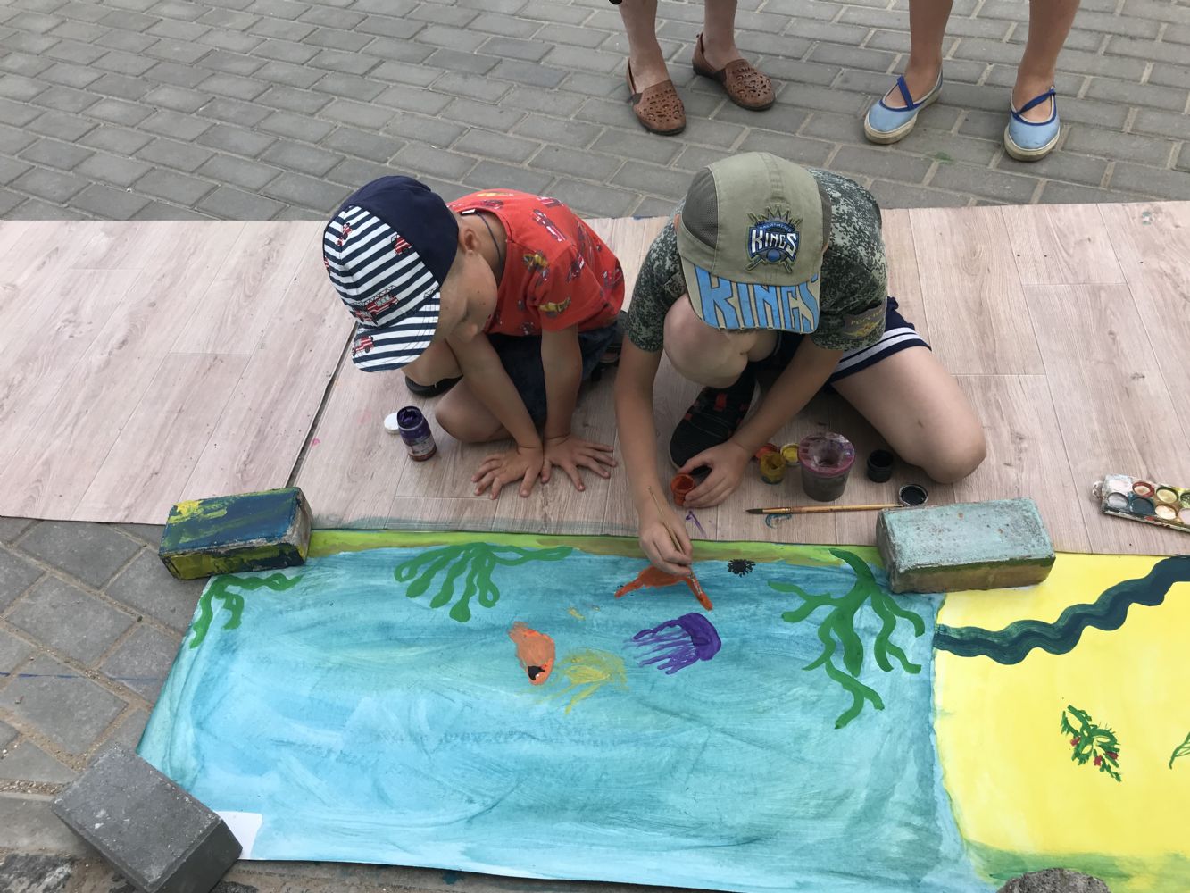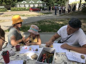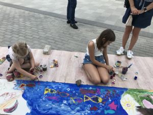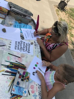 Уже третье лето подряд мы приглашаем всех гостей и жителей города принять участие в создании общего большого рисунка. На столах и асфальтовой дорожке мы раскатываем листы бумаги, выдаём краски и фломастеры. Тема рисования свободная, присоединиться может любой желающий.