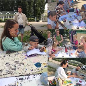 Сегодня мы завершили наш благотворительный проект «Свободный художник». Ежедневно мы рисовали с детьми у Уточьей башни: расстилали лист бумаги метров на 10, раскладывали карандаши, фломастеры, кисти, краски и вместе с детьми рисовали общий рисунок.