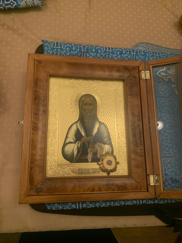 Особенная радость пришла в тот момент, когда мы узнали, что в ризнице на сохранении находится уникальное духовное наследие — фелонь преподобного Сергия. Каждый волонтер смог аккуратно прикоснуться к ковчегу с этим сокровищем. Следующее, что нам показали — иконы с мощами святых Павла Таганрогского и мученика Савина. Они никогда не покидают ризницы, ведь их памятные даты приходятся на памятные даты других святых, празднуемых в Лавре.