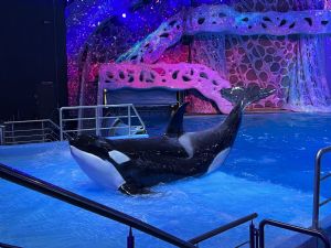Самым долгожданным событием всего шоу была не только развязка новогодней истории главных героев, но и появление королев этого вечера – косаток. Словами не описать ту красоту, которую увидели все гости этого шоу. Воистину – это прекрасные создания Творца. Безмолвные, спокойные и грациозные. С каким-то своим внутренним достоинством выныривали из пучины вод и завораживали наши души. Дети замирали и зал погружался в тишину в предвкушении очередного появления косаток.