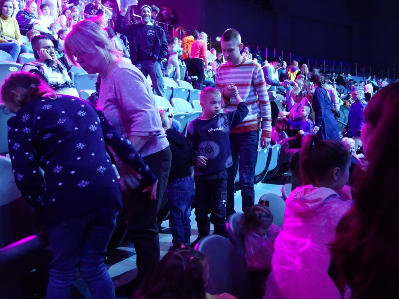 Вскоре прозвучало приглашение в зал, и мы поспешили занять свои места. Для тех, кто сидел на самых первых рядах, заботливо были оставлены дождевики, ребята с предвкушением и азартом стали быстрее их распаковывать и облачаться в защитный плащ.
