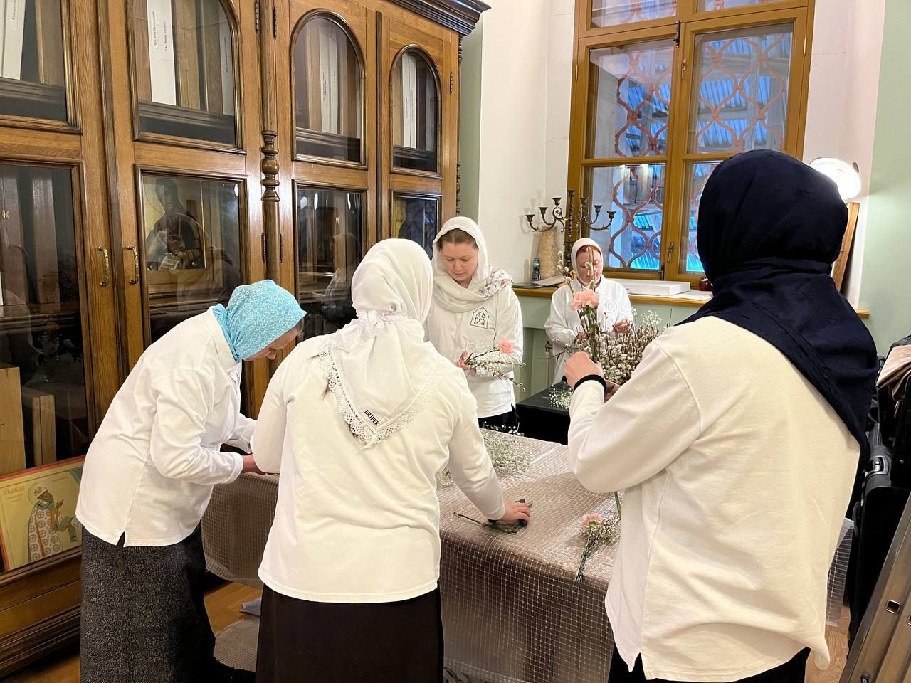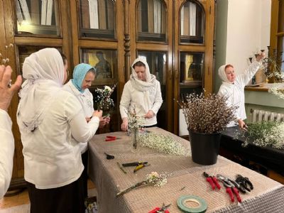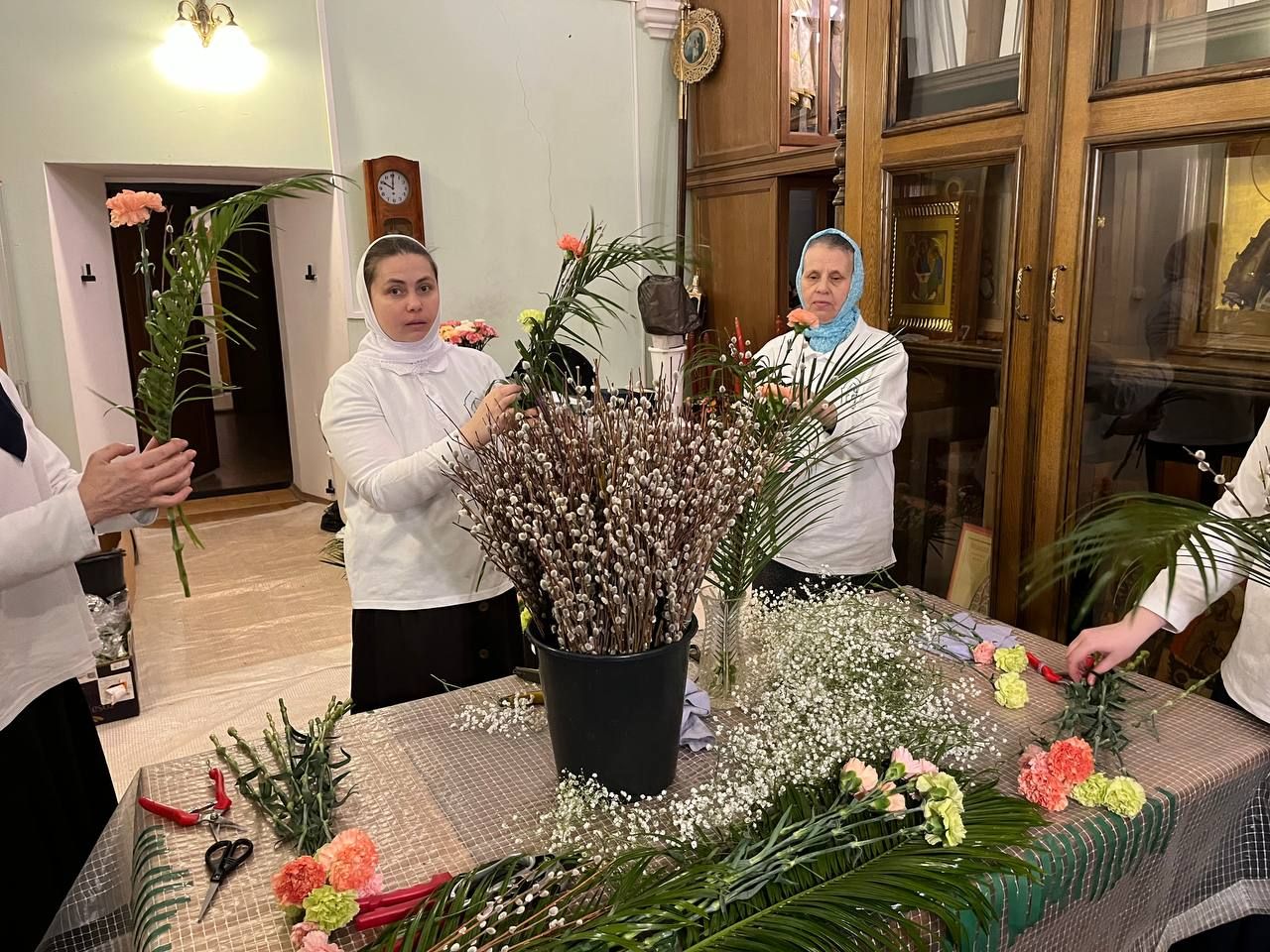 Благодарим волонтеров-лавриотов за помощь в подготовке в празднику Входа Господня в Иерусалим! В 9 утра, накануне праздника, в ризнице Трапезного храма наши мастерицы приступили к трудам: подрезали веточки вербы и пальмовые листья, и, добавляя розы и белоснежную россыпь цветочков гипсофилы, составляли праздничные букеты. Это и труд и отдохновение: общение с природой является лучшим отдыхом. «Цветы, не только извне украшают нашу жизнь. Созерцание красоты изменяет нас изнутри: умиротворяет, ободряет, вдохновляет. Это не случайно. Красивый цветок, где бы он ни рос, хранит память о благолепии и гармонии первозданного мира, еще не поврежденного богоотступничеством людей. Христос указывал на красоту цветов, как образ заботы Творца даже о малом Своем творении (см. Мф. 6, 28—29)»[i].