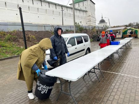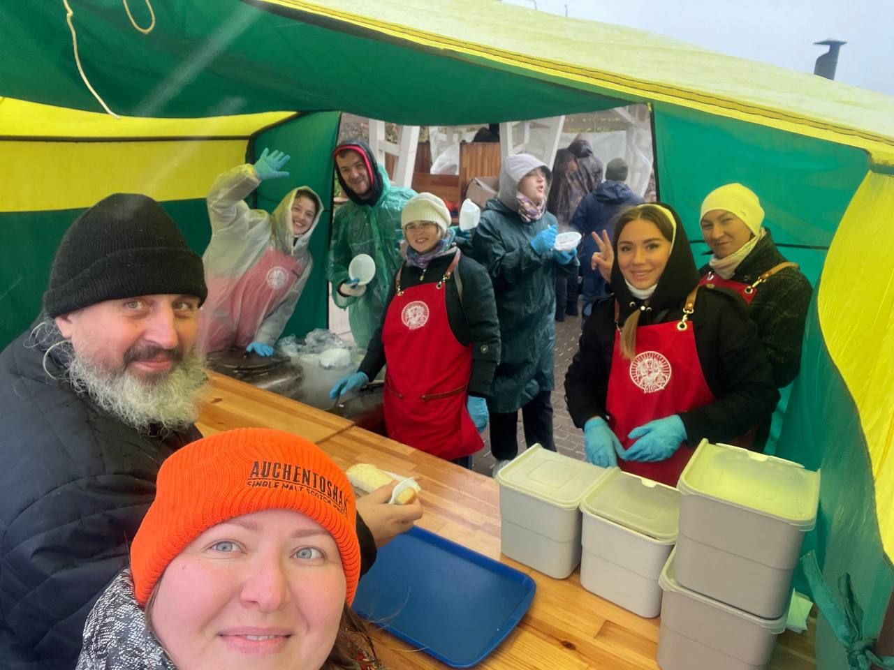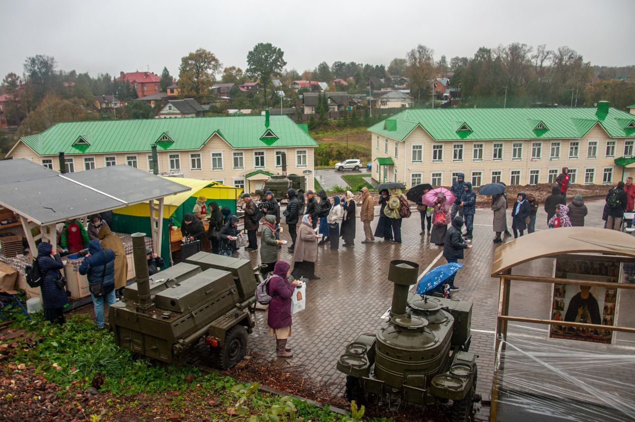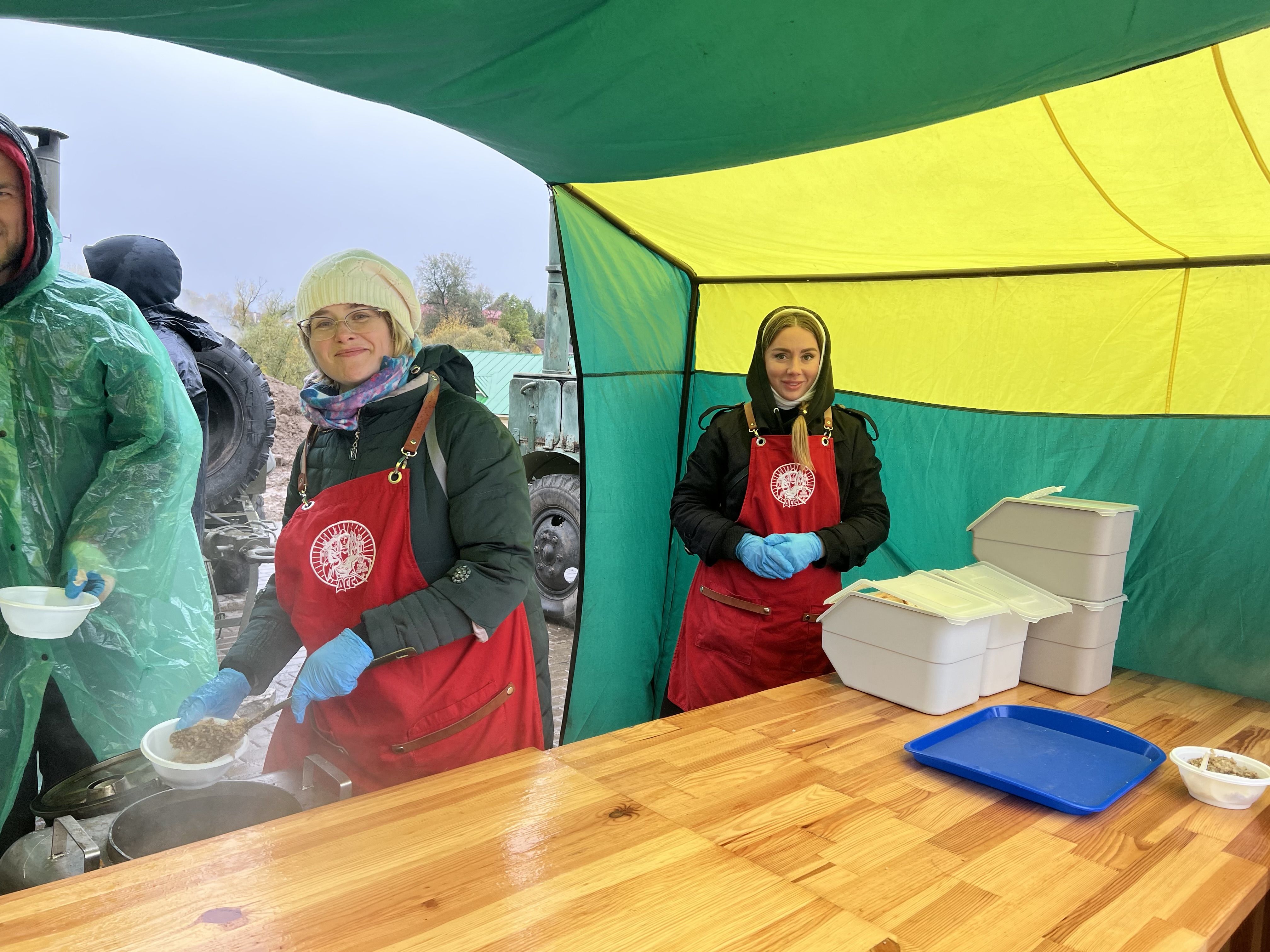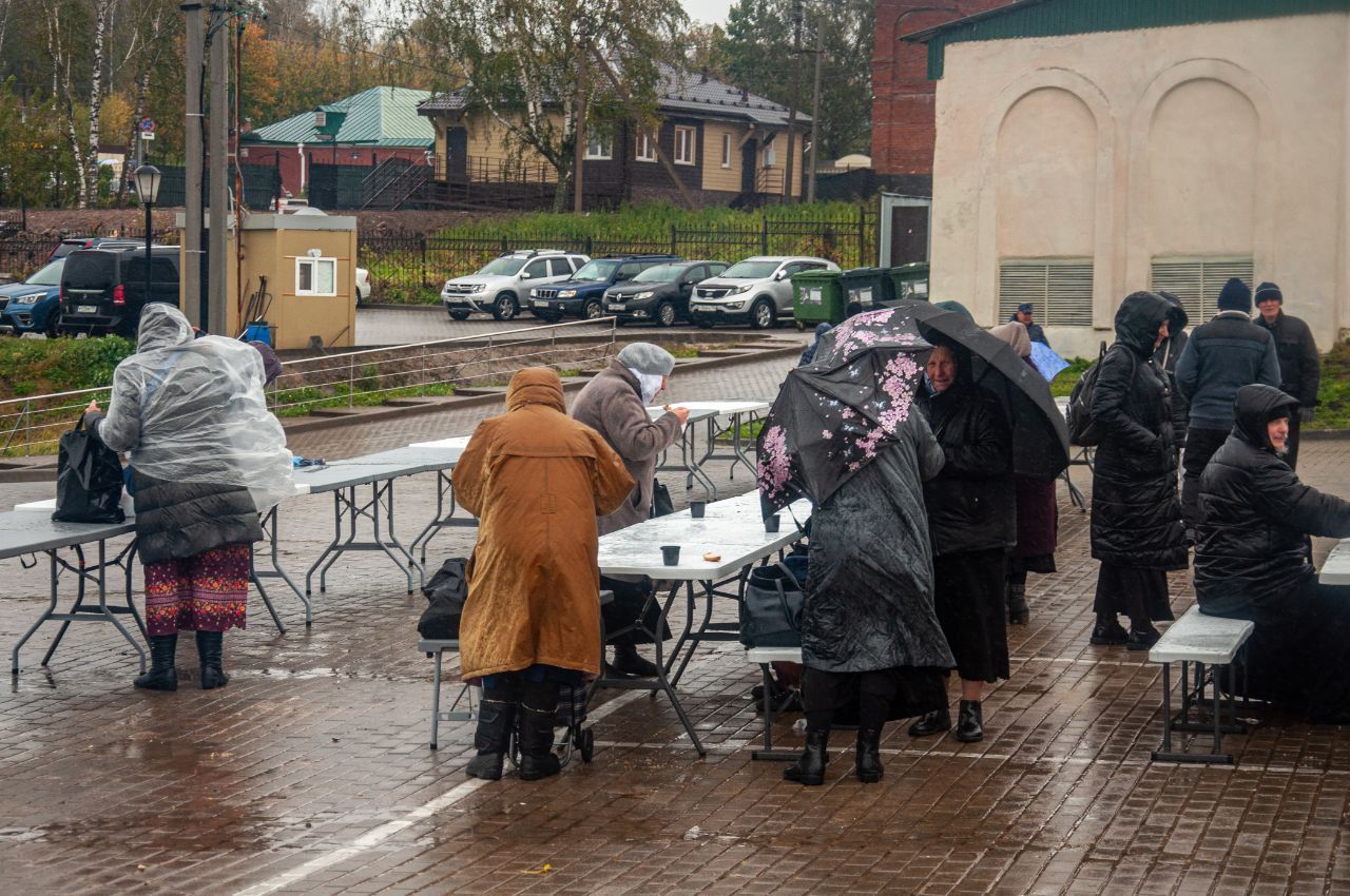 В этот раз погода не жаловала: порывистый ветер, дождь со снегом, но послушание надобно исполнить, о чем знали все. Утеплившись и набравшись терпения, вступили мы в неравный бой со стихией. Веря, что преподобный Сергий все управит. И, действительно, не стоило и сомневаться. Паломники шли к трапезе под дождем, зная, что согреются теплой кашей и ароматным чаем. И в такую погоду нам удалось покормить более 1500 человек.