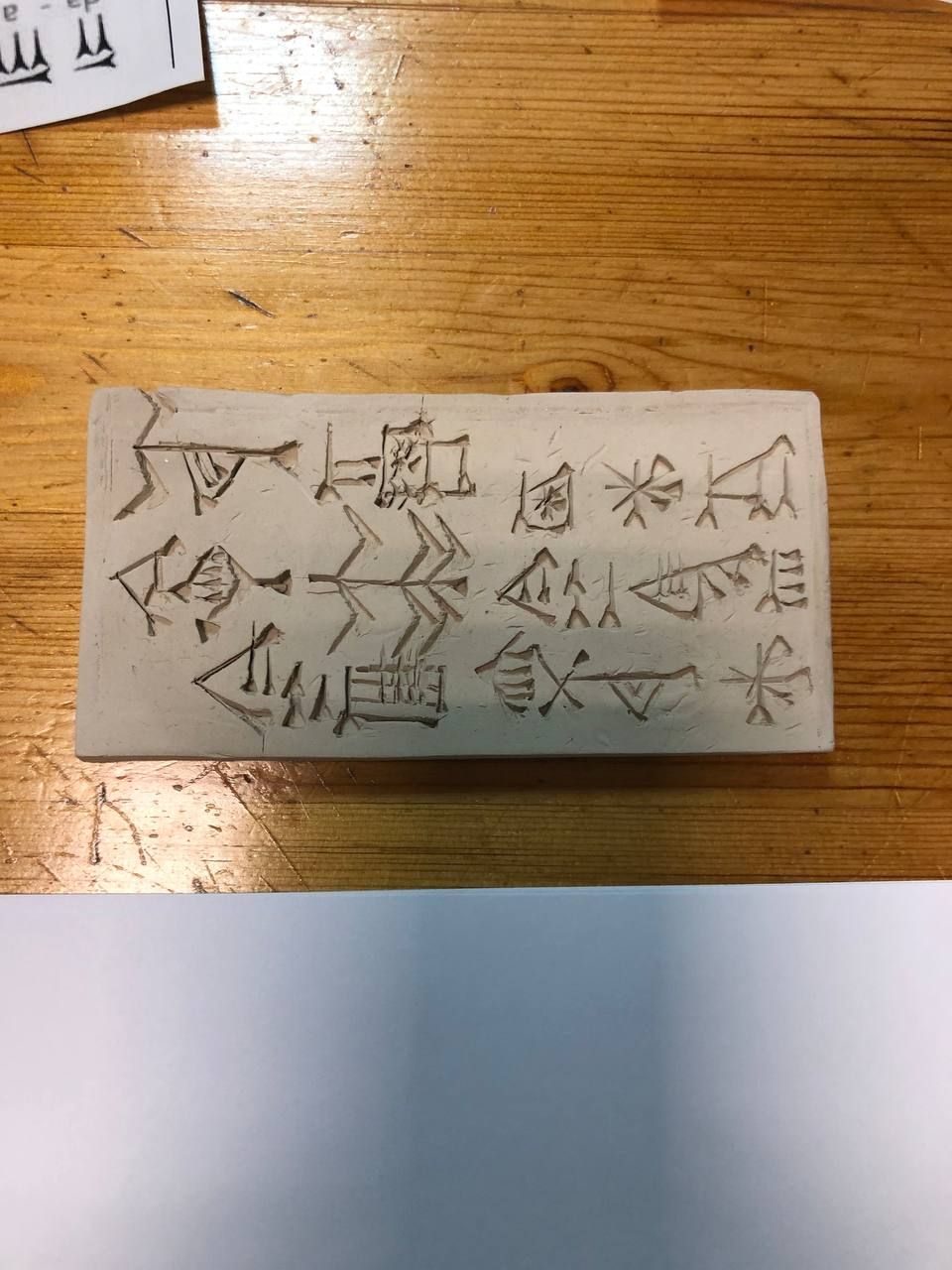 После Троицкого собора мы решили, что замёрзли так, что без горячего выжить не сможем, тем более, что в Паломнической слободе нас уже ждали с обедом. Ребята с удовольствием отведали блюда из братской трапезной, поговорили с Никитой и тут наши чудеса продолжились: на связь вышел о. Парфений, ему нельзя выходить на улицу, поэтому он руководил нашими действиями онлайн. Нам принесли глиняные дощечки и стилусы для письма на них. Отец Парфений подробно объяснил как и для чего эти таблички использовались в прошлом и под его чутким руководством ребята попробовали свои силы в шумерской письменности.