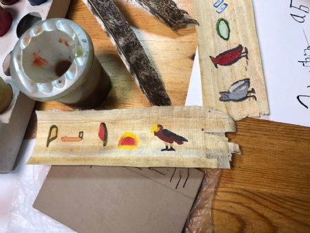 Все очень старались, хотя сначала ни у кого практически не получалось. Но о. Парфений терпеливо объяснял и помогал словом. И вот уже из-под стилуса Валерии выходят ровные знаки, означающие её имя. А там и Виктория втянулась и тоже очень красиво написала Вика.