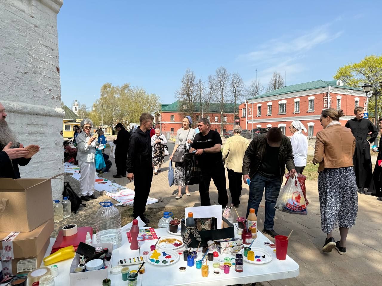 Благодаря большому количеству разных карандашей, фломастеров и красок все желающие могли создать один общий пасхальный рисунок. Во время творческого проекта студенты миссионерского отдела МДА проводили беседы с родителями на тему «Христова Воскресения» и по возможности увлекали в эту беседу и детей. По окончанию творческого процесса все участники получили подарки: детские молитвословы для детей, а для взрослых книги об отцах нашей обители.