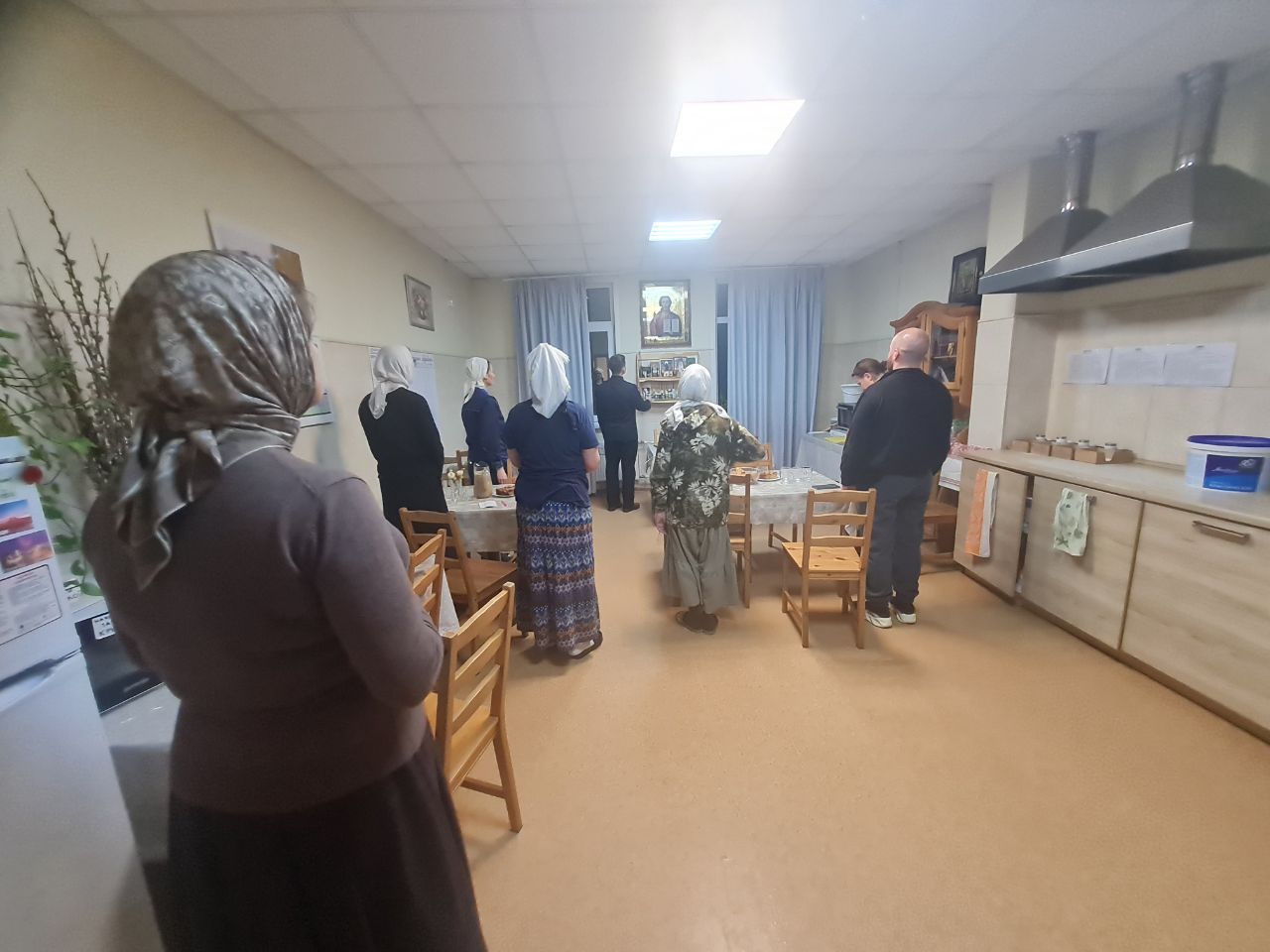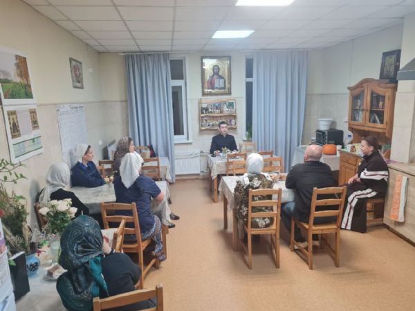 В волонтерском домике вновь лекция-беседа по аскетике. Студент Московской духовной академии Даниил Улитин вдохновляет наших лавриотов духовными поучениями преподобного Аввы Дорофея.