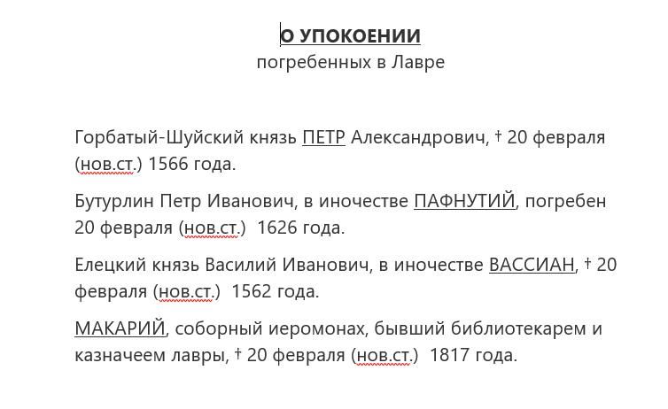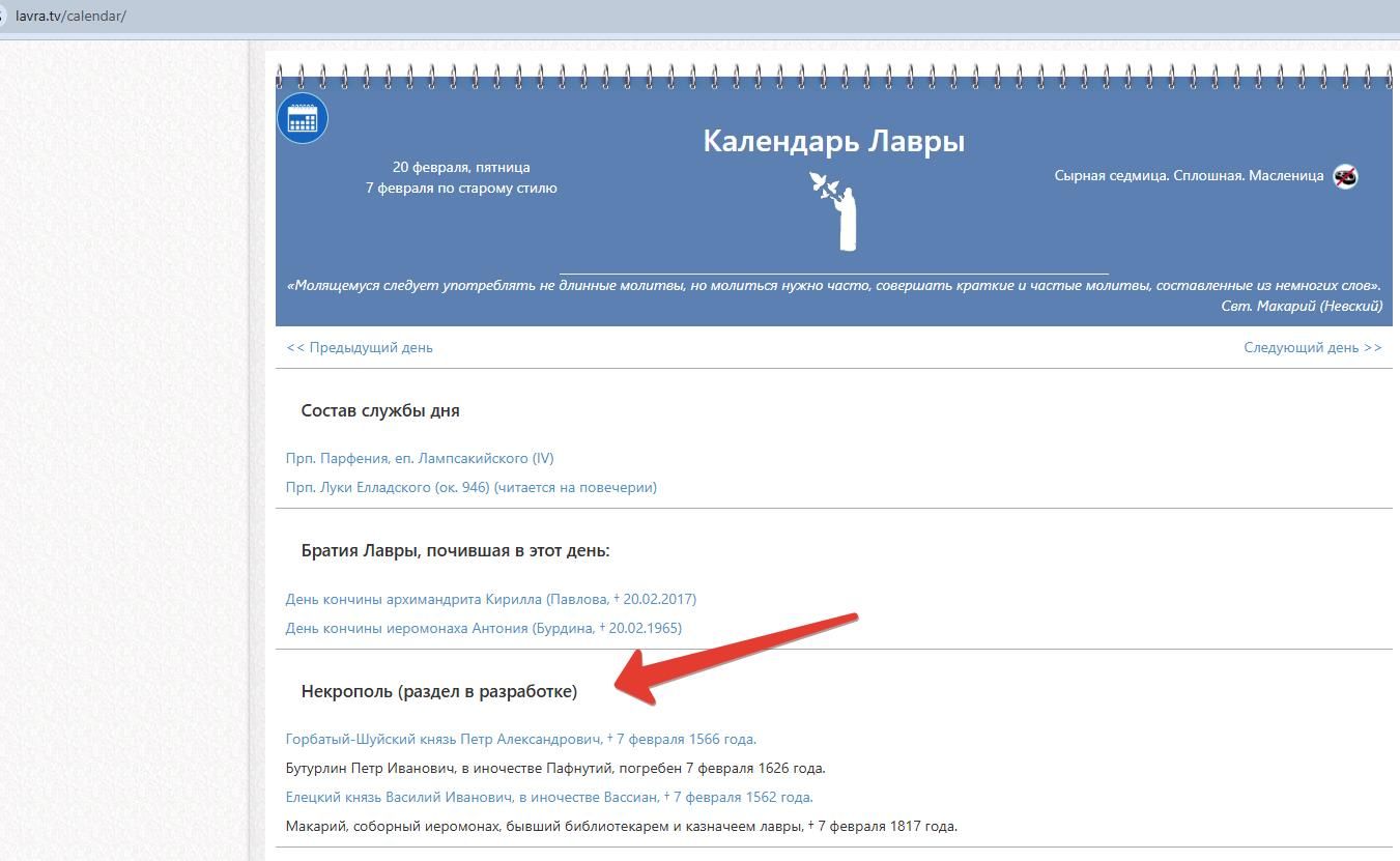 К 14 февраля, ко дню Вселенской родительской субботы, Соцслужба подготовила списки дле поименного повиновения захороненных в Лавре, а также поминовения по списку кормовых панихид (подготовлены списки, для удобства и точности даты переведены на новый стиль). Имена берутся каждый день из раздела «Некрополь» в календаре на этом сайте. В том же разделе на каждый день есть краткие сведения о погребенных. Приглашаем всех желающих ознакомится с даным разделом! Ежедневное поминовение погребенных в обители преподобного Сергия – наш долг.