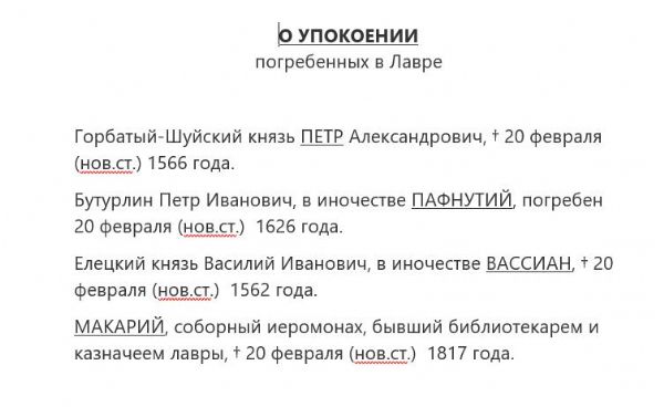 На территории Лавры захоронены около 3500 чел. Из которых 1250 мы знаем поименно. На каждый день года приходится память кого-либо из похороненных в Лавре. Это монахи, благодетели, жертвователи и защитники Обители. Также у нас сохранился список так называемых «кормовых панихид». Кормовыми называются панихиды от того, что для поминовения нижеозначенных лиц даны вклады в обитель и часть суммы отделена для трапезы братской (на корм братии).
