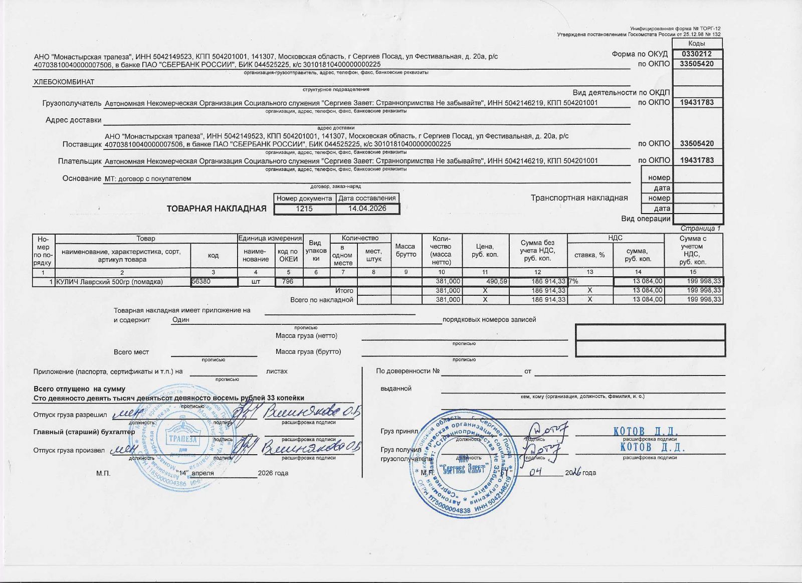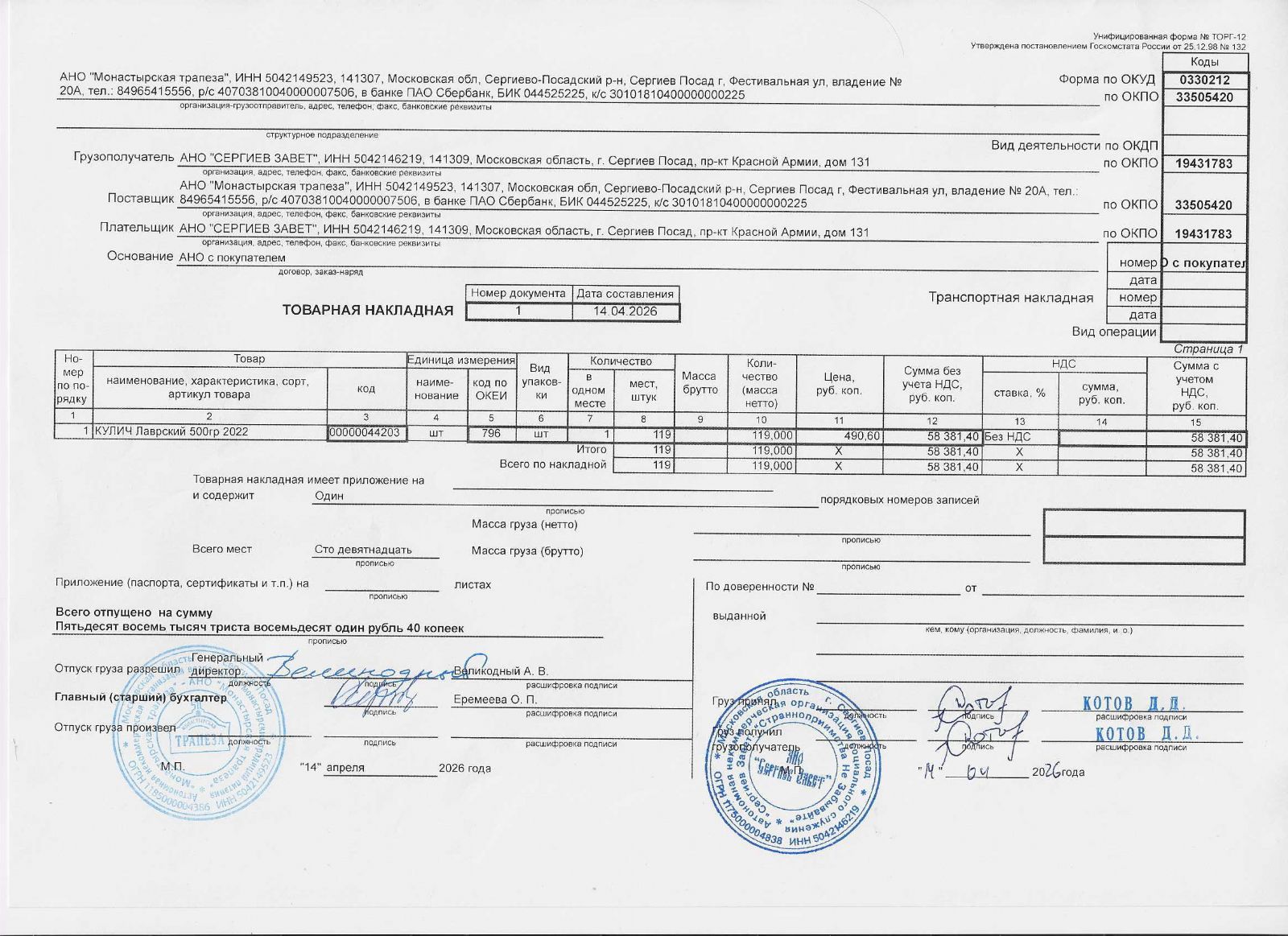 В этом году мы закупили 381 шт. «кулич лаврский 500 г», 119 шт. «кулич лаврский 500 г» Соцслужба получила в качестве благотворительного пожертвования от АНО «Монастырская трапеза».