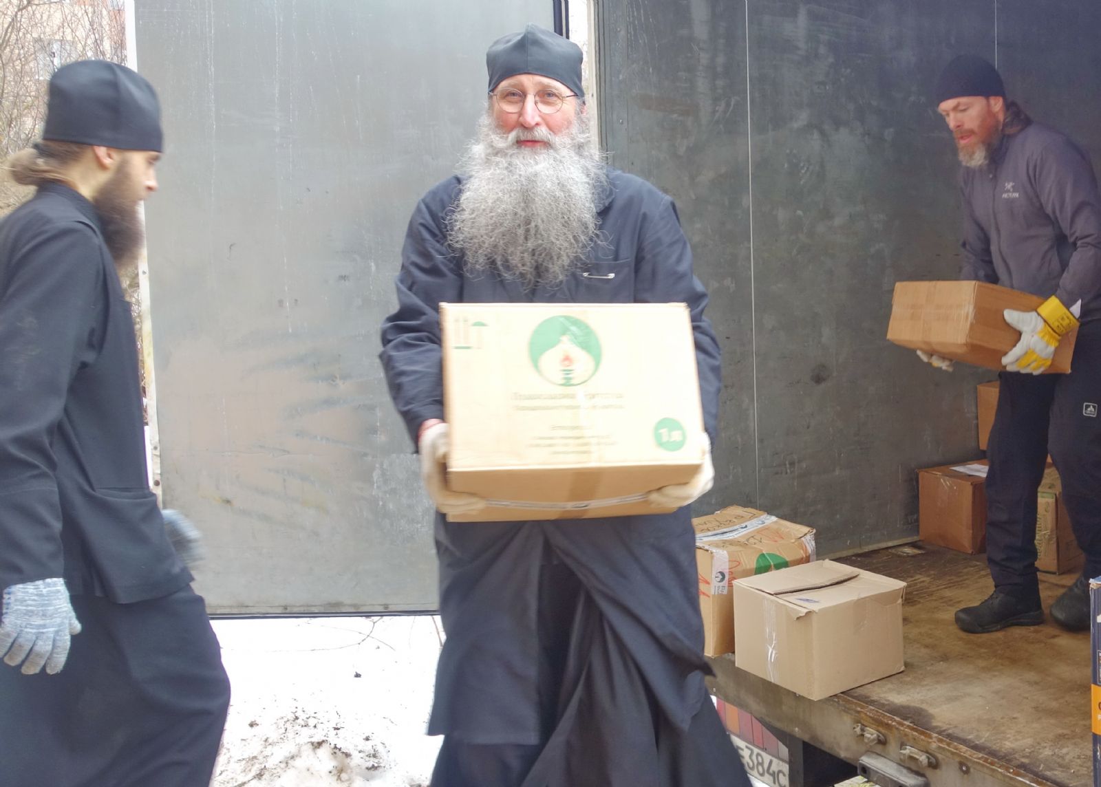 На складе дружно и ловко волонтеры и трудники монастыря занимаются погрузкой гуманитарной помощи. Передают коробки друг другу так быстро, что не получается ничего разглядеть, только и слышишь, как они перекрикиваются, сообщая стоящему рядом, легкий это